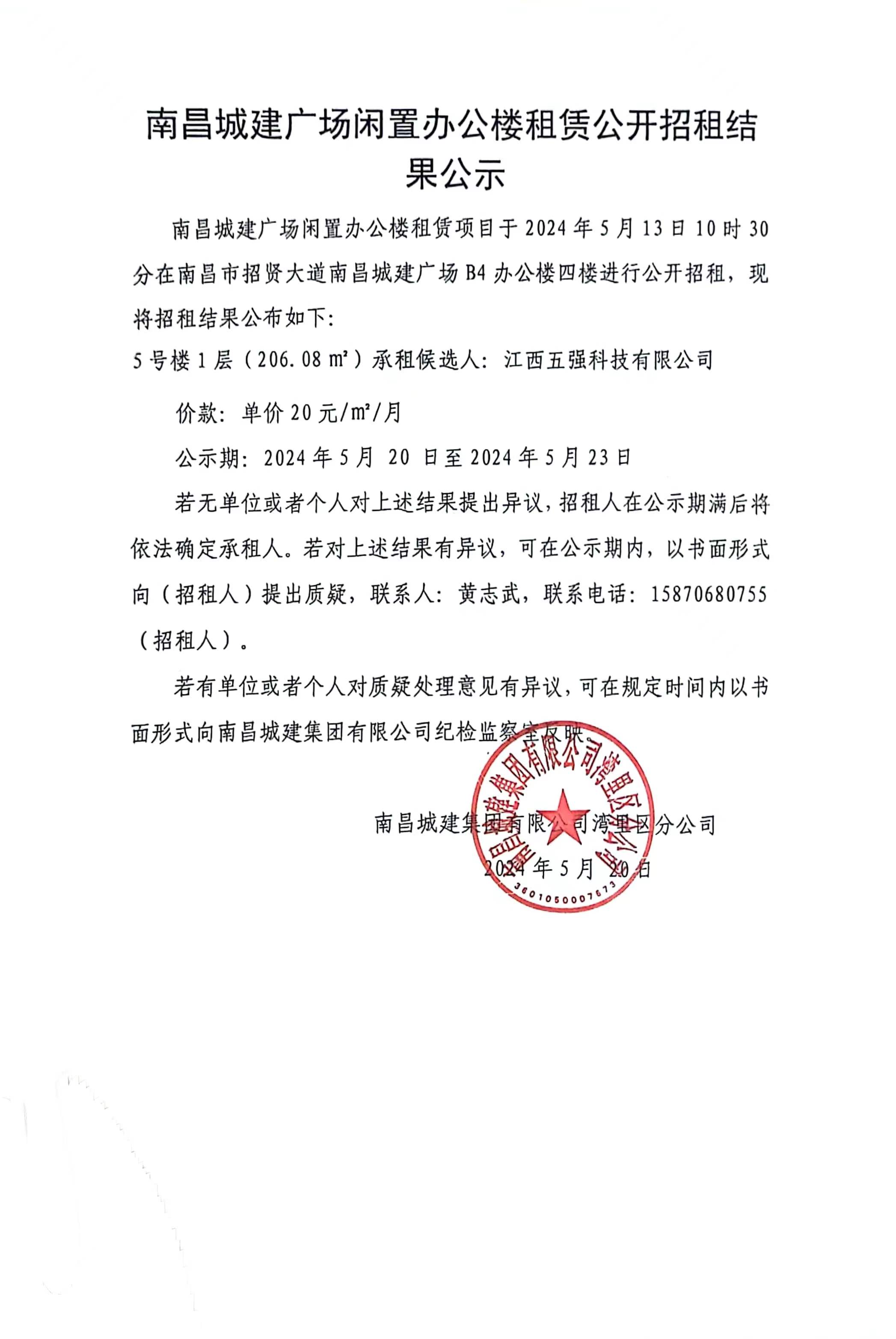 ok138cn太阳集团广场闲置办公楼租赁项目于2024年5月13日10时30分在南昌市招贤大道ok138cn太阳集团广场B4办公楼四楼进行公开招租,现将招租结果公布如下: