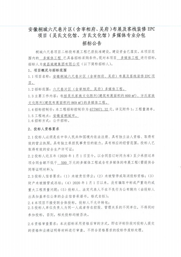 安徽桐城六尺巷片区(含宰相府、吴府)布展及客栈装修EPC项目(吴氏文化馆、方氏文化馆)多媒体招标公告