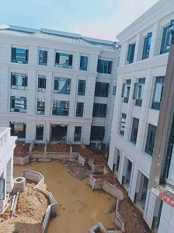 园林景观工程施工:室外挡墙已完成40%,预计8月底完工;市政管网已完成60%,预计7月底完工;室外填土已完成70%,预计7月24日完工;水池已完成10%,预计8月底完工;连廊已完成20%,预计7月底完工;商业街广场铺砖已完成。
