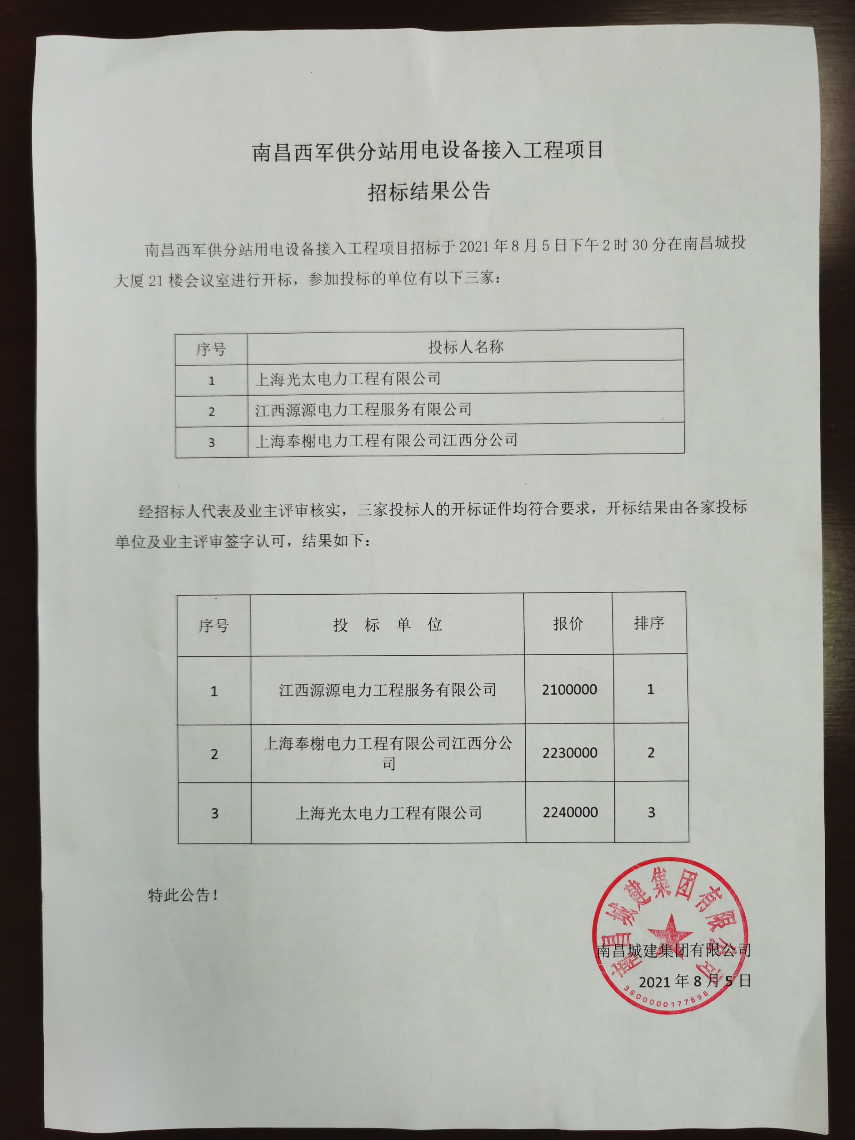 南昌西军供分站用电设备接入工程项目招标于2021年8月5日下午2时30分在南昌城投大厦21楼会议室进行开标,参加投标的单位有以下三家: