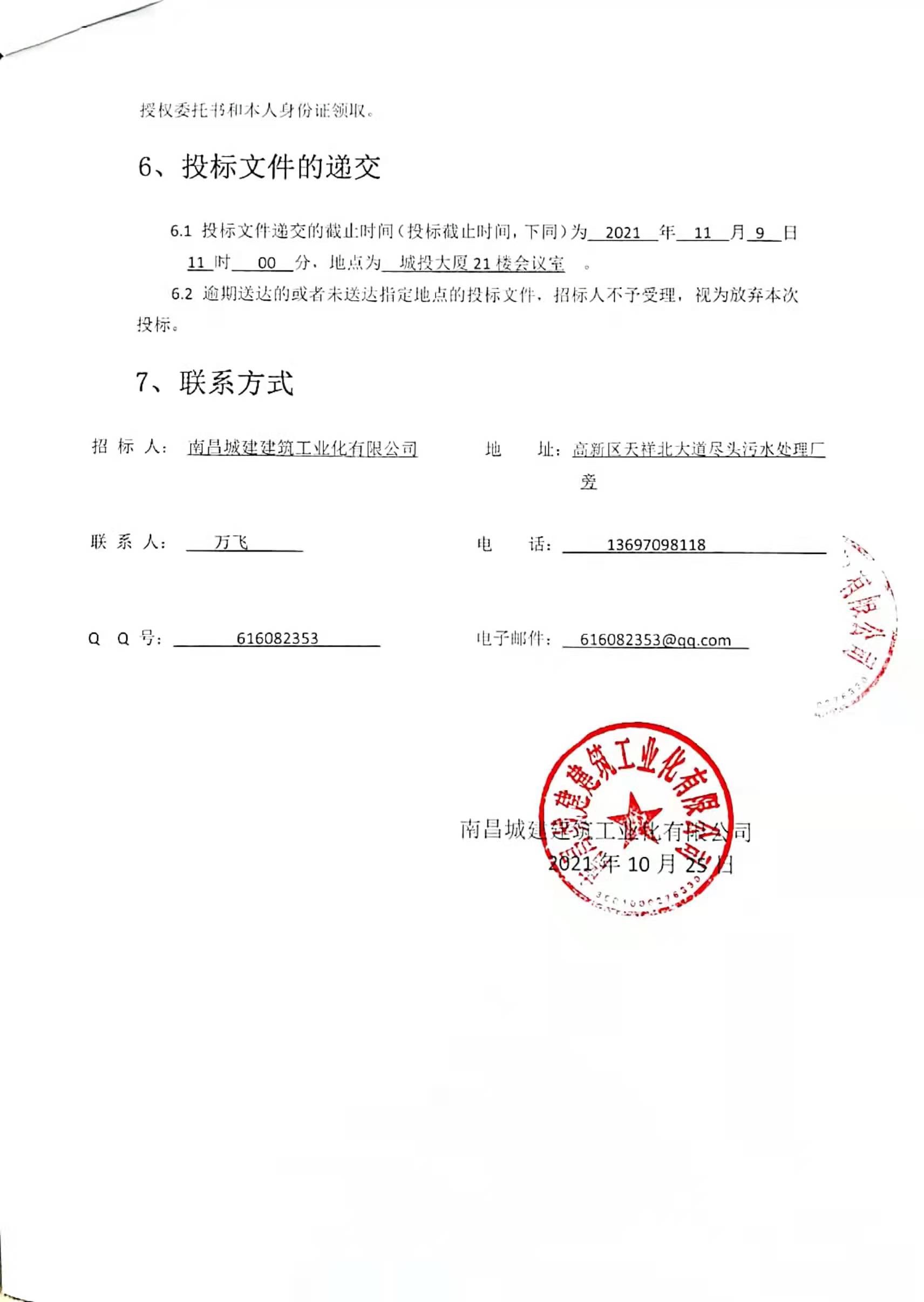 6.1 投标文件递交的截止时间(投标截止时间,下同)为 2021 年 11 月 9 日11 时 00 分,地点为 城投大厦21楼会议室 。