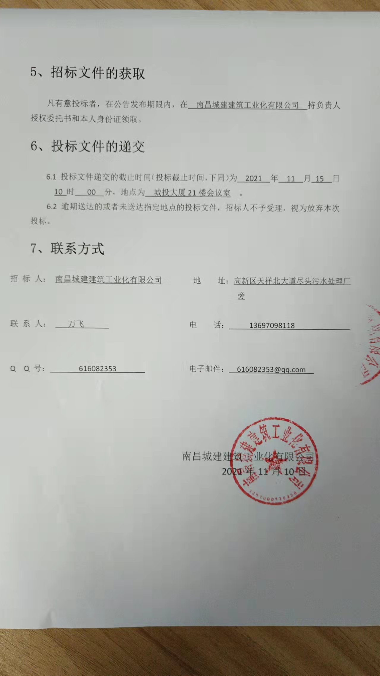 6.1 投标文件递交的截止时间(投标截止时间,下同)为 2021 年 11 月 15 日10 时 00 分,地点为 城投大厦21楼会议室 。