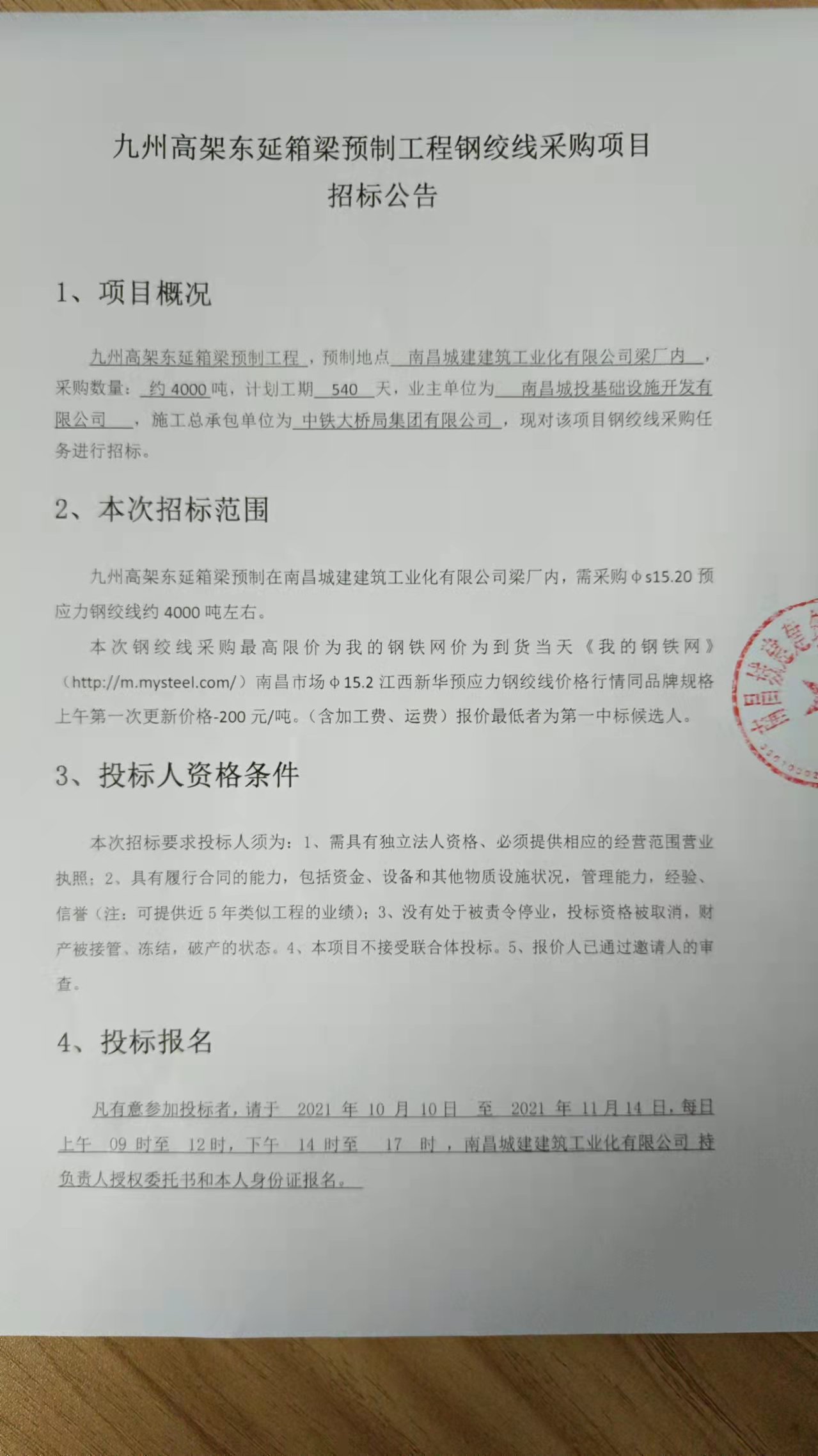 九州高架东延箱梁预制工程 ,预制地点 ok138cn太阳集团建筑工业化有限公司梁厂内 ,采购数量: 约4000吨,计划工期 540 天,业主单位为 南昌城投基础设施开发有限公司 ,施工总承包单位为 中铁大桥局集团有限公司 ,现对该项目钢绞线采购任务进行招标。