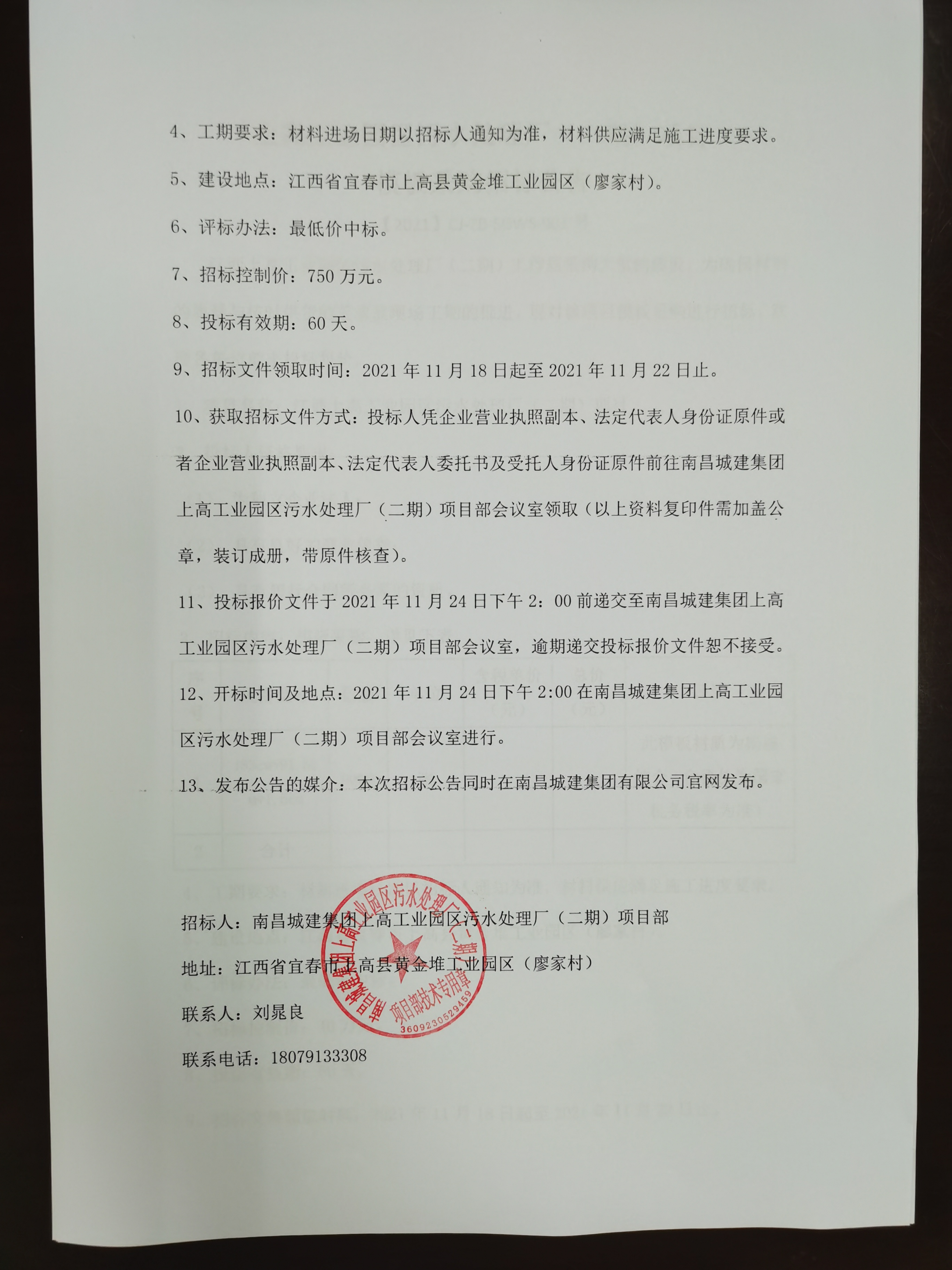 11、投标报价文件于2021年11月24日下午2:00前递交至ok138cn太阳集团集团上高工业园区污水处理厂(二期)项目部会议室,逾期递交投标报价文件恕不接受。
