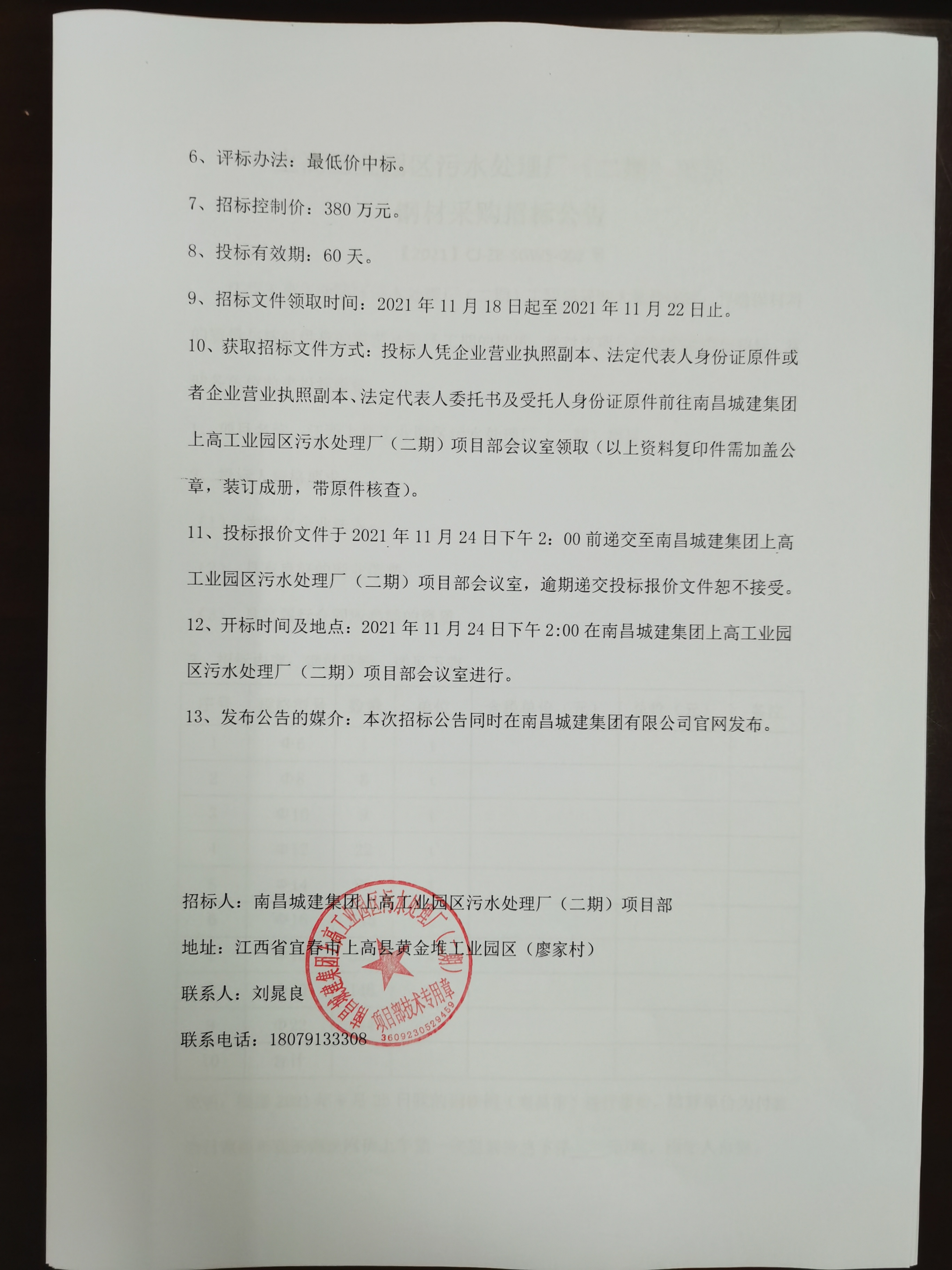 11、投标报价文件于2021年11月24日下午2:00前递交至ok138cn太阳集团集团上高工业园区污水处理厂(二期)项目部会议室,逾期递交投标报价文件恕不接受。