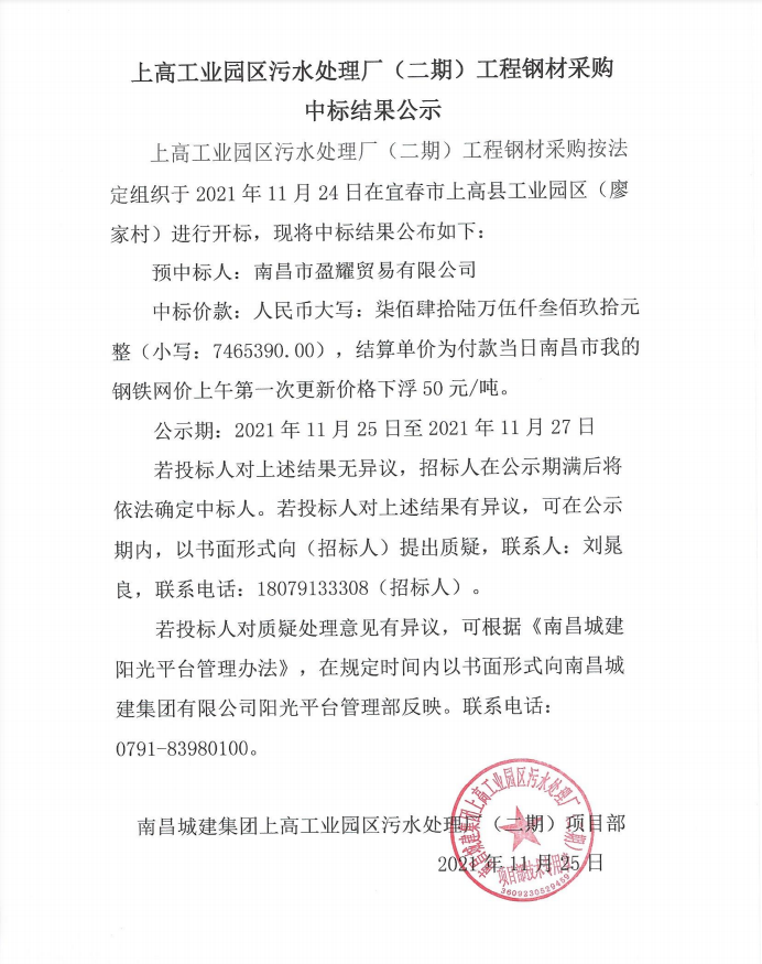 上高工业园区污水处理厂(二期)工程钢材采购按法定组织于2021年11月24日在宜春市上高县上高工业园区(廖家村)进行开标,现将中标结果公布如下: