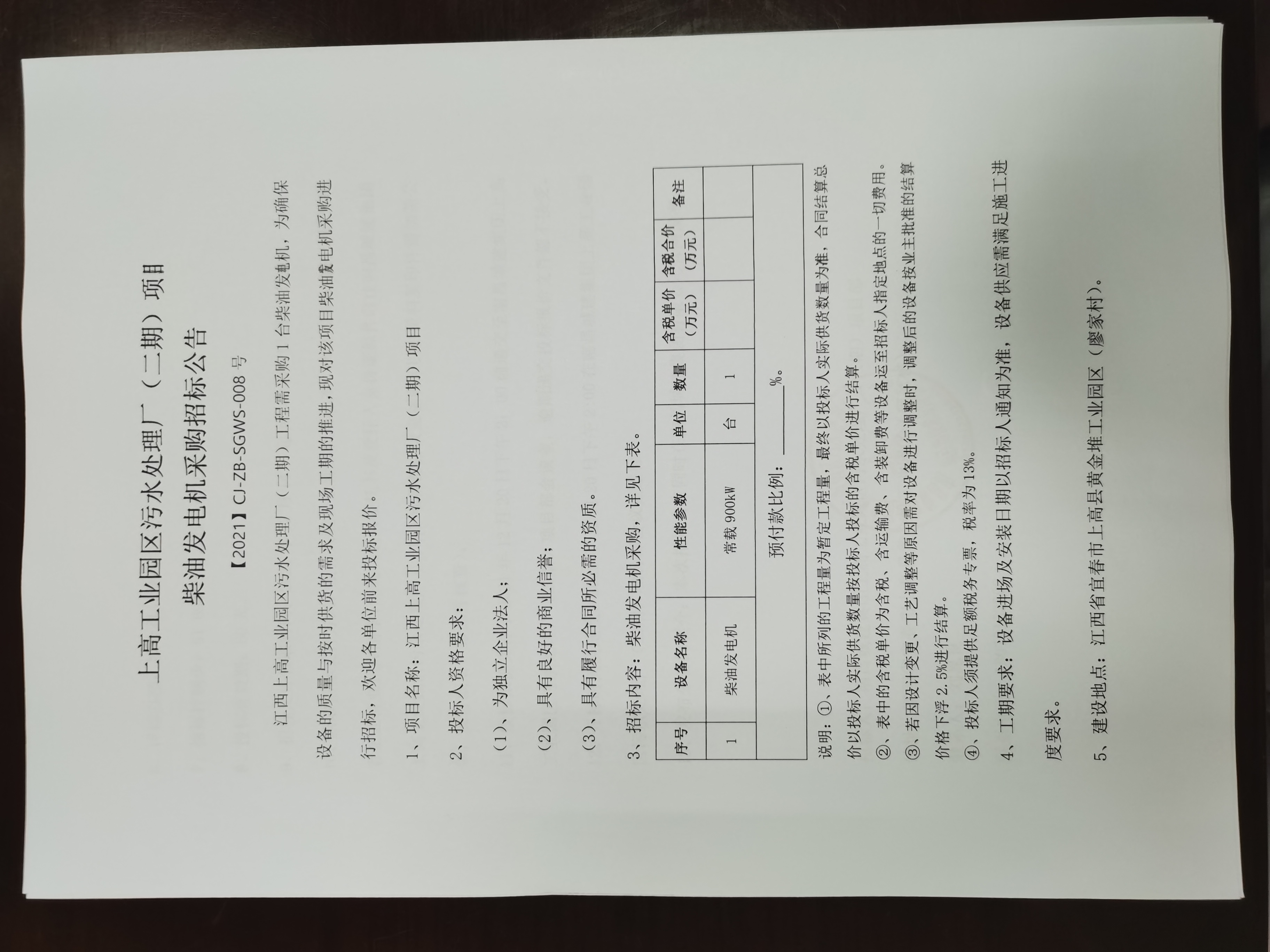 江西上高工业园区污水处理厂(二期)工程需采购1台柴油发电机,为确保设备的质量与按时供货的需求及现场工期的推进,现对该项目柴油发电机采购进行招标,欢迎各单位前来投标报价。