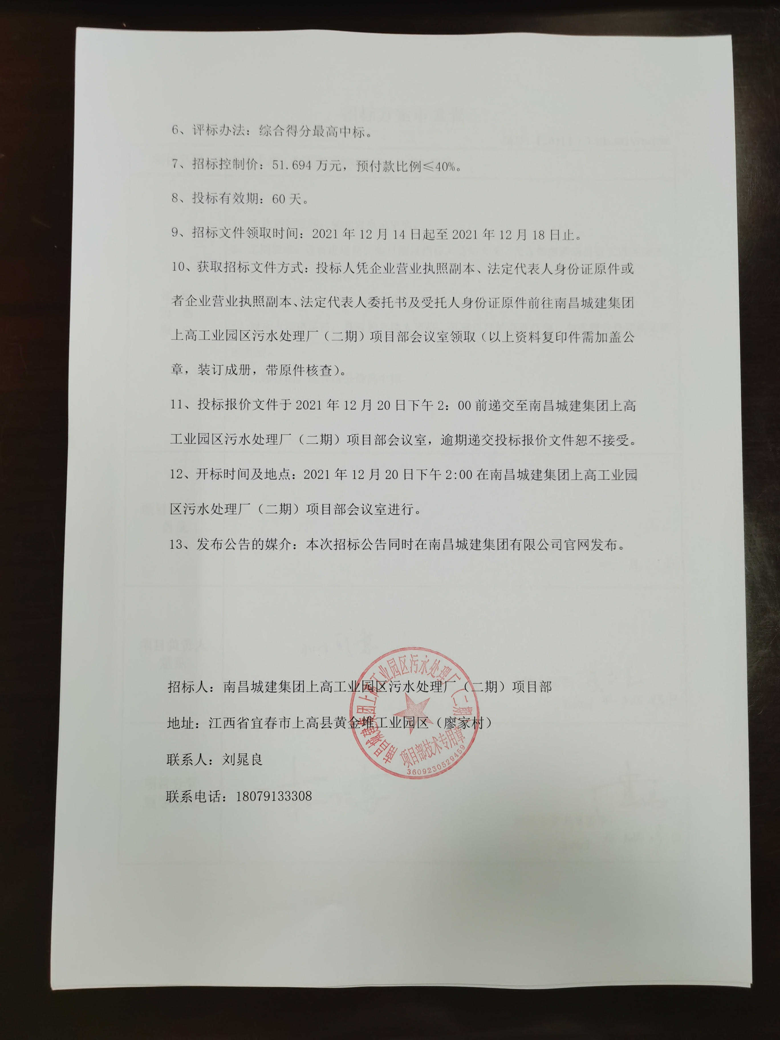 12、开标时间及地点:2021年12月20日下午2:00在ok138cn太阳集团集团上高工业园区污水处理厂(二期)项目部会议室进行。