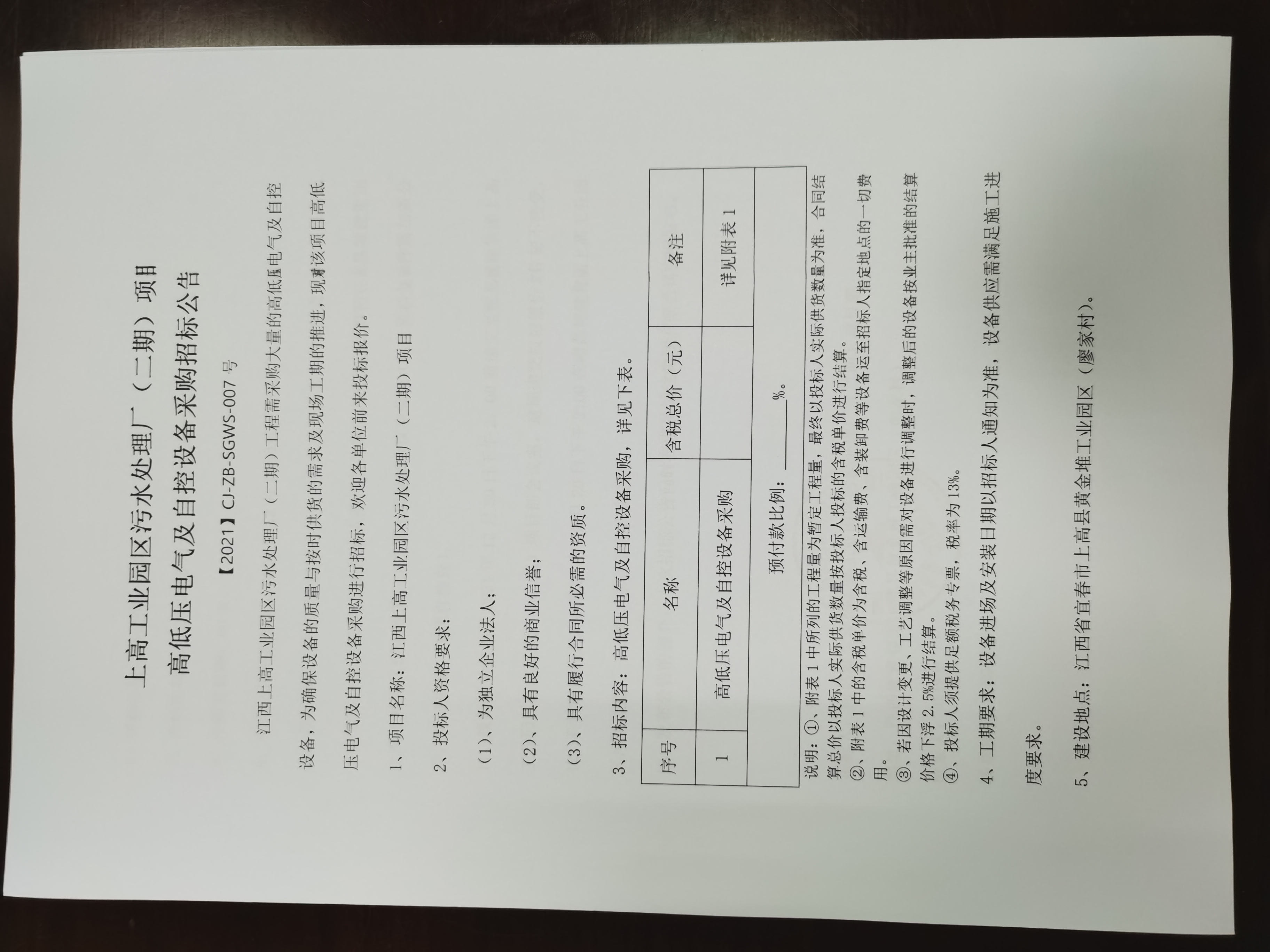 江西上高工业园区污水处理厂(二期)工程需采购大量的高低压电气及自控设备,为确保设备的质量与按时供货的需求及现场工期的推进,现对该项目高低压电气及自控设备采购进行招标,欢迎各单位前来投标报价。