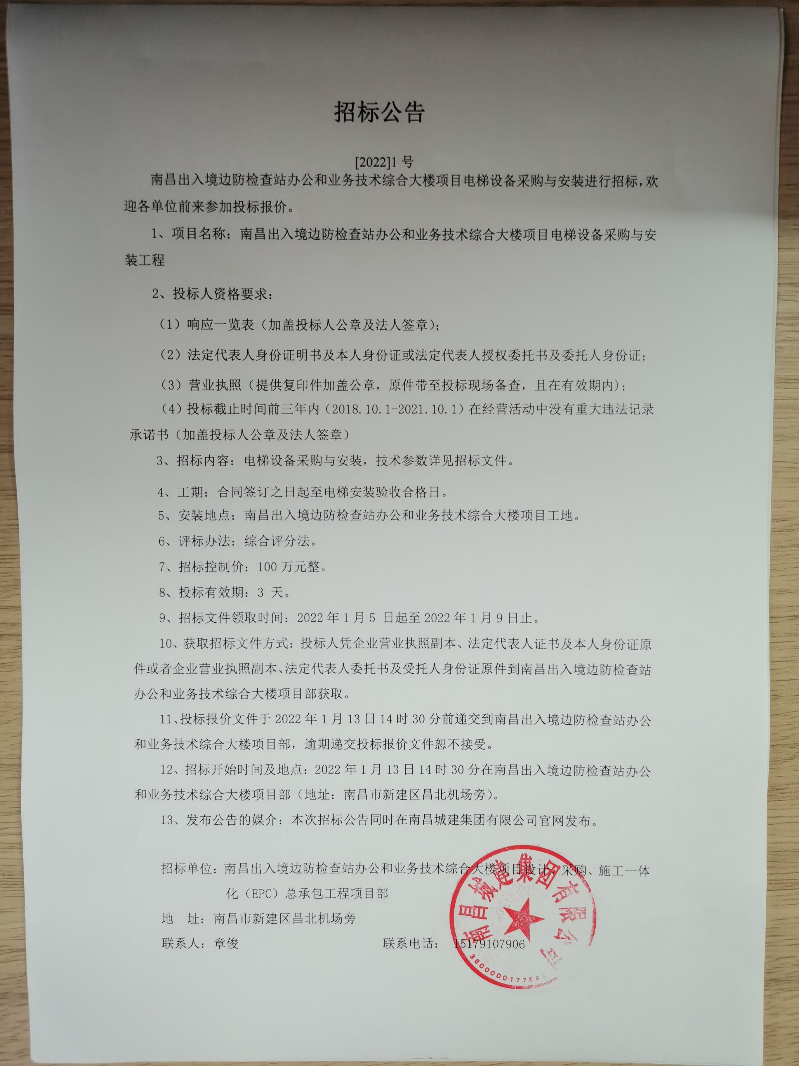 12、招标开始时间及地点:2022年1月13日14时30分在南昌出入境边防检查站办公和业务技术综合大楼项目部(地址:南昌市新建区昌北机场旁)。