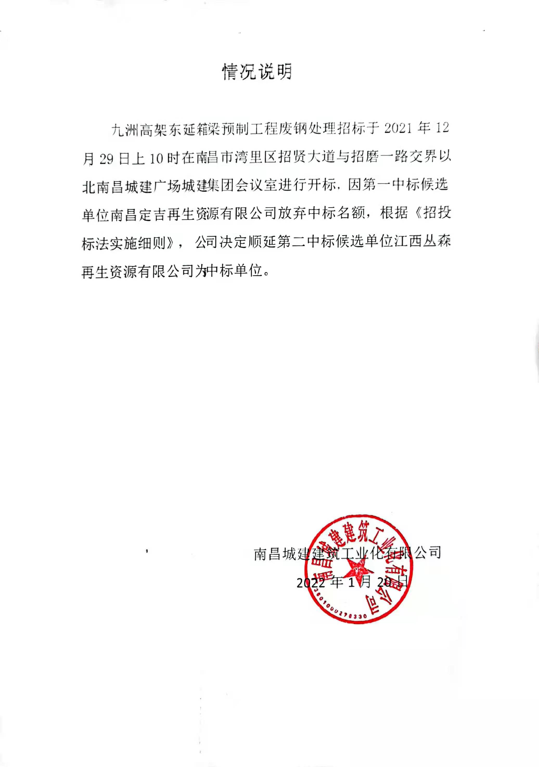 九洲高架东延箱梁预制工程废钢处理招标于2021年12月29日上午10时在南昌市湾里区招贤大道与招磨一路交界以北ok138cn太阳集团广场城建集团会议室进行开标,因第一中标候选单位南昌定吉再生资源有限公司放弃中标名额,根据《招投标法实施细则》, 公司决定顺延第二中标候选单位江西丛森再生资源有限公司为中标单位。