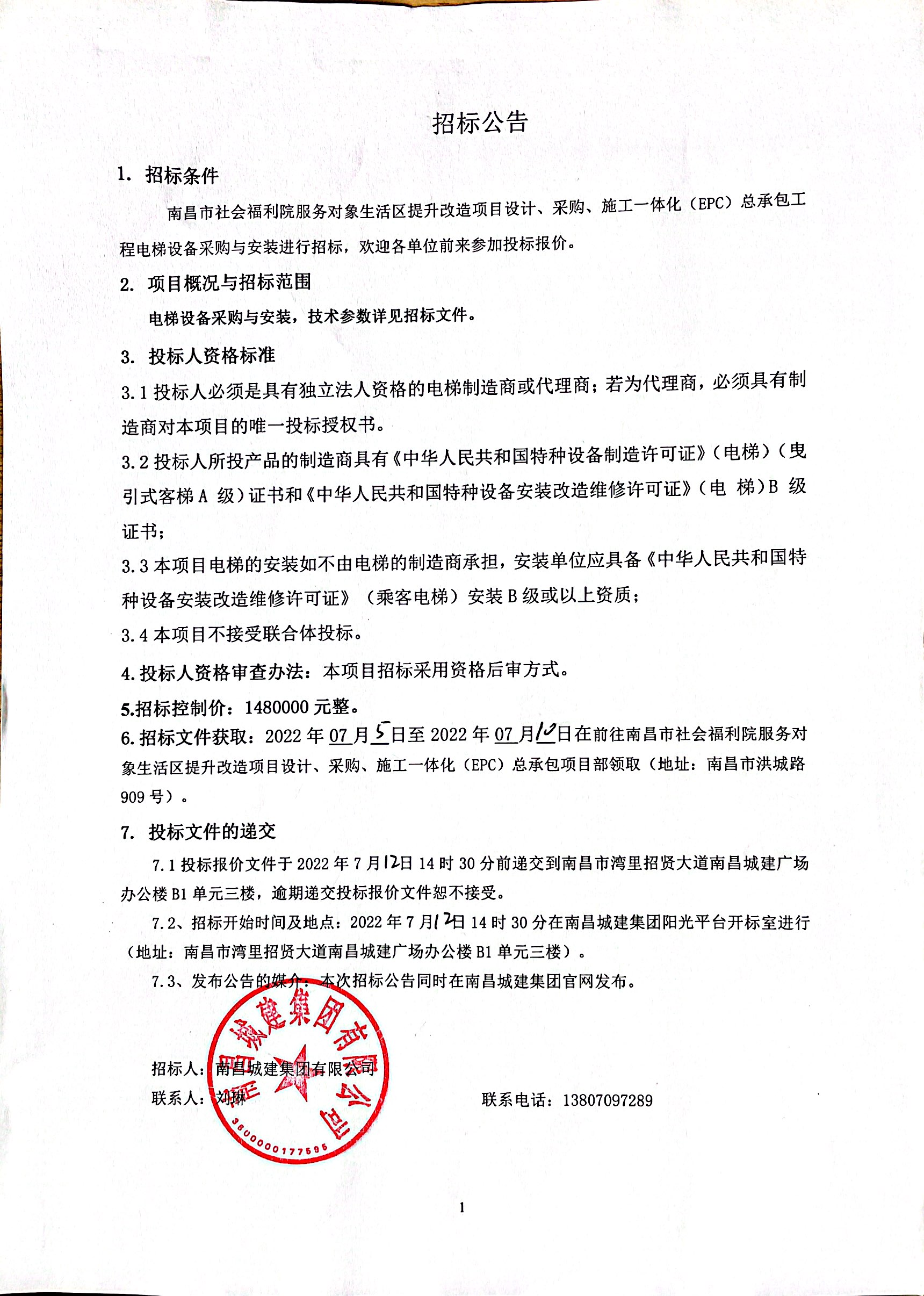 南昌市社会福利院服务对象生活区提升改造项目设计、采购、施工一体化(EPC)总承包工程电梯设备采购与安装进行招标,欢迎各单位前来参加投标报价。