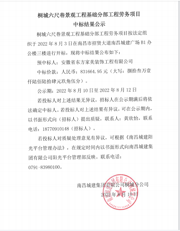桐城六尺巷景观工程基础分部工程劳务项目按法定组织于2022年8月3日在南昌市招贤大道ok138cn太阳集团广场B1办公楼三楼进行开标,现将中标结果公布如下: