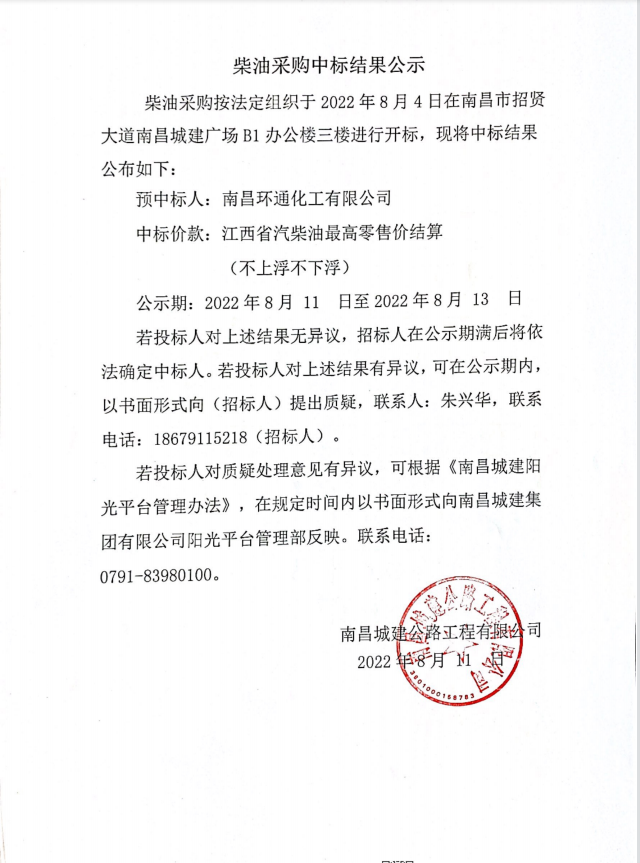 柴油采购按法定组织于2022年8月4日在南昌市招贤大道ok138cn太阳集团广场B1办公楼三楼进行开标,现将中标结果公布如下: