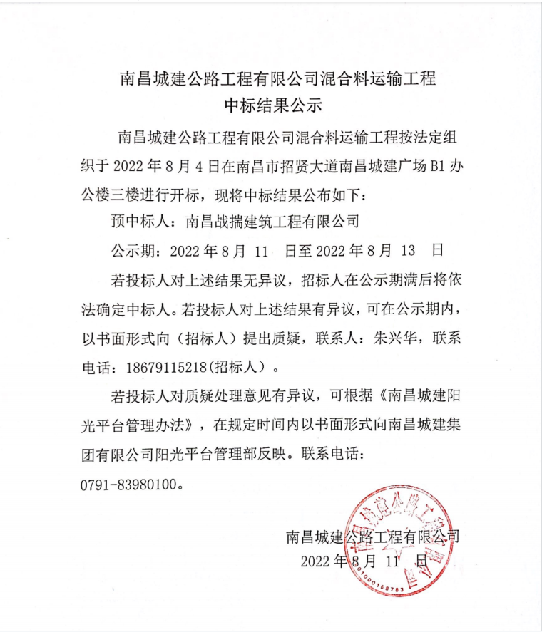 ok138cn太阳集团公路工程有限公司混合料运输工程按法定组织于2022年8月4日在南昌市招贤大道ok138cn太阳集团广场B1办公楼三楼进行开标,现将中标结果公布如下: