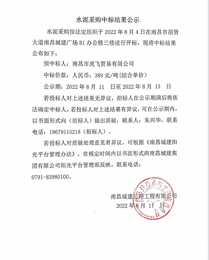 水泥采购按法定组织于2022年8月4日在南昌市招贤大道ok138cn太阳集团广场B1办公楼三楼进行开标,现将中标结果公布如下: