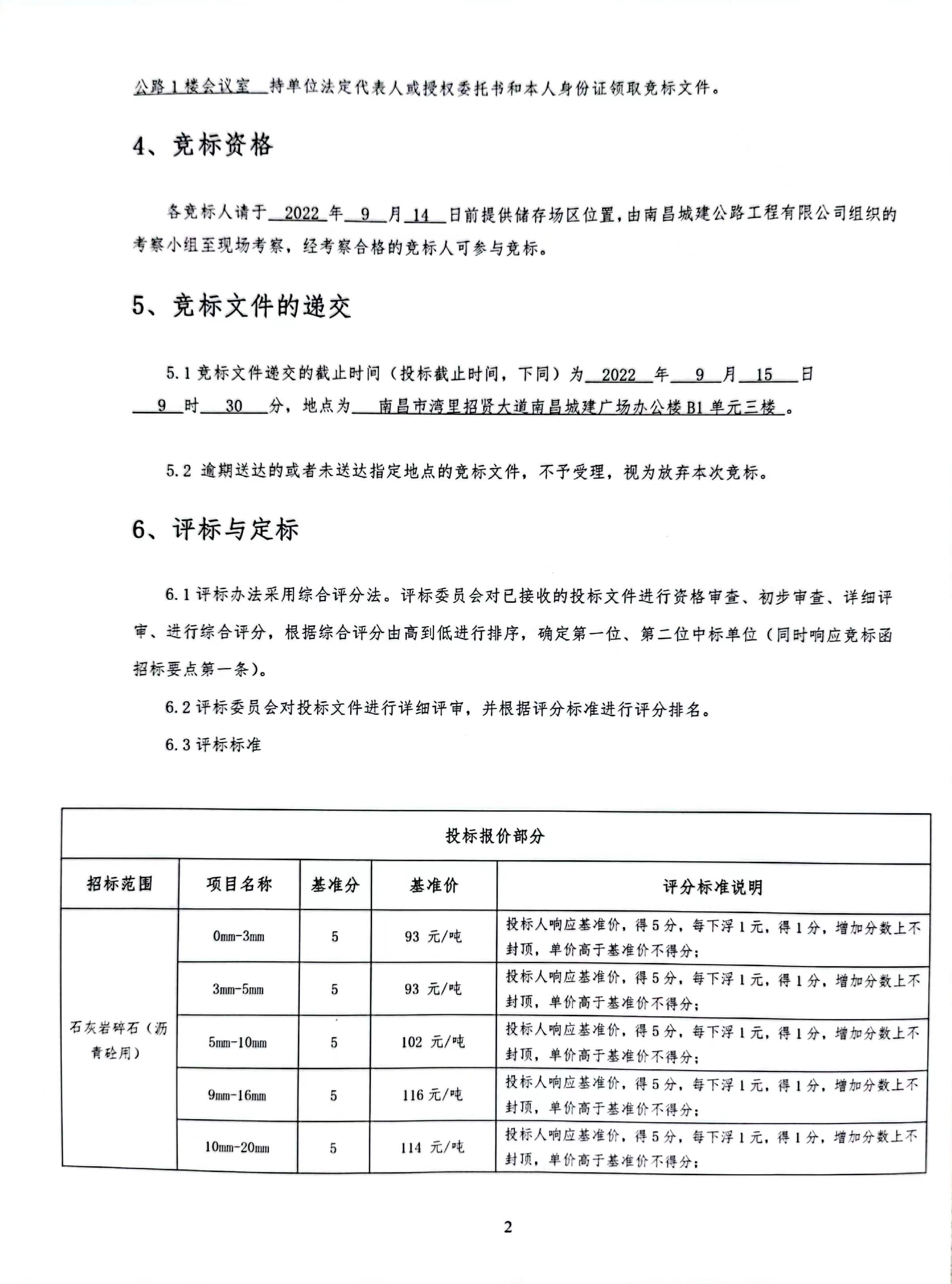 10mm-20mm | 5 | 110 元/吨 | 投标人响应基准价,得5分,每下浮1元,得1分,增加分数上不封顶,单价高于基准价得0分; | |
