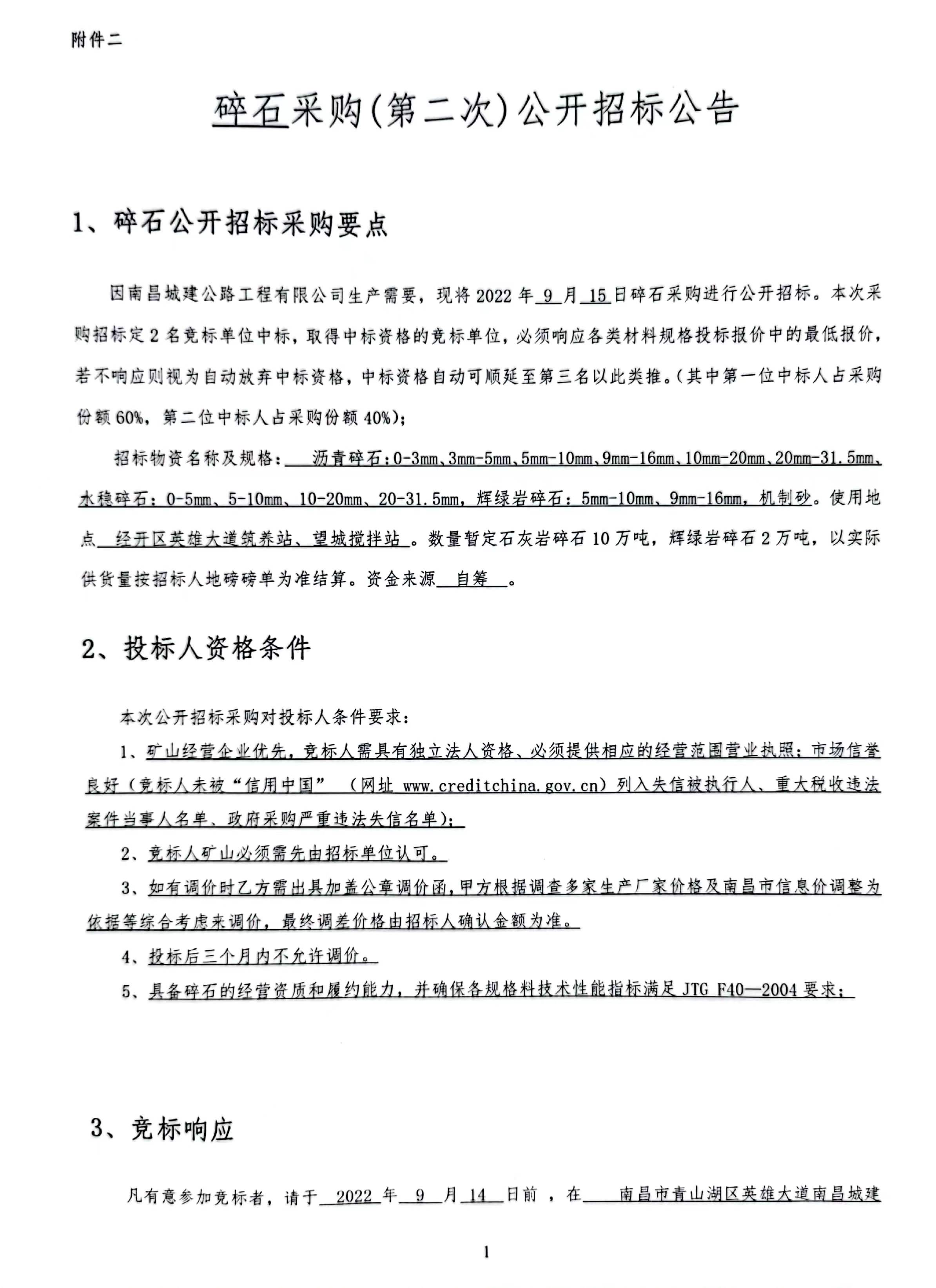 因ok138cn太阳集团公路工程有限公司生产需要,现将2022年 9 月 15日碎石采购进行公开招标。本次采购招标定2名竞标单位中标,取得中标资格的竞标单位,必须响应各类材料规格投标报价中的最低报价,若不响应则视为自动放弃中标资格,中标资格自动可顺延至第三名以此类推。(其中第一位中标人占采购份额60%,第二位中标人占采购份额40%);