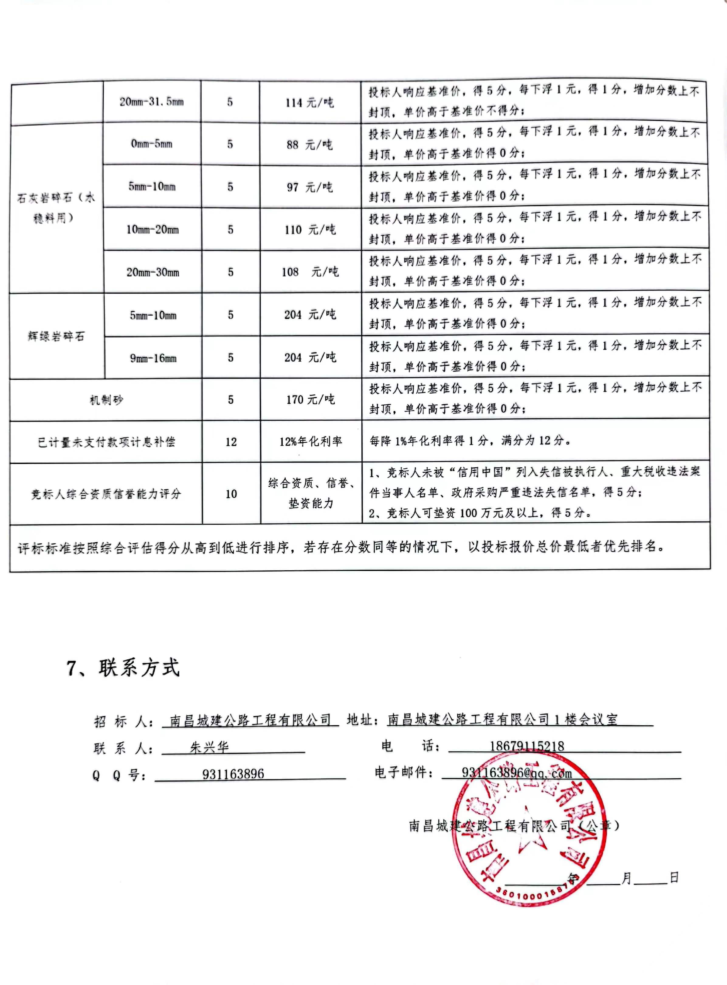10mm-20mm | 5 | 114 元/吨 | 投标人响应基准价,得5分,每下浮1元,得1分,增加分数上不封顶,单价高于基准价不得分; | |