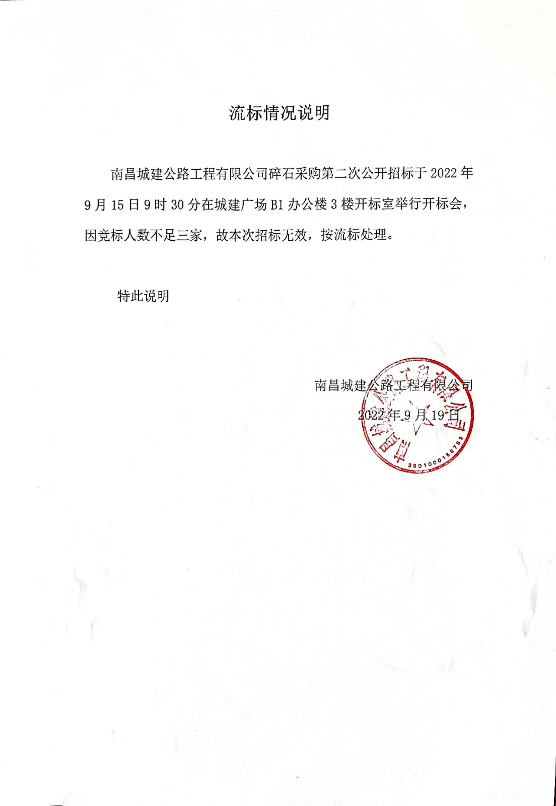 ok138cn太阳集团公路工程有限公司碎石采购第二次公开招标于2022年9月15日9时30分在城建广场B1办公楼3楼开标室举行开标会,因竞标人数不足三家,故本次招标无效,按流标处理。