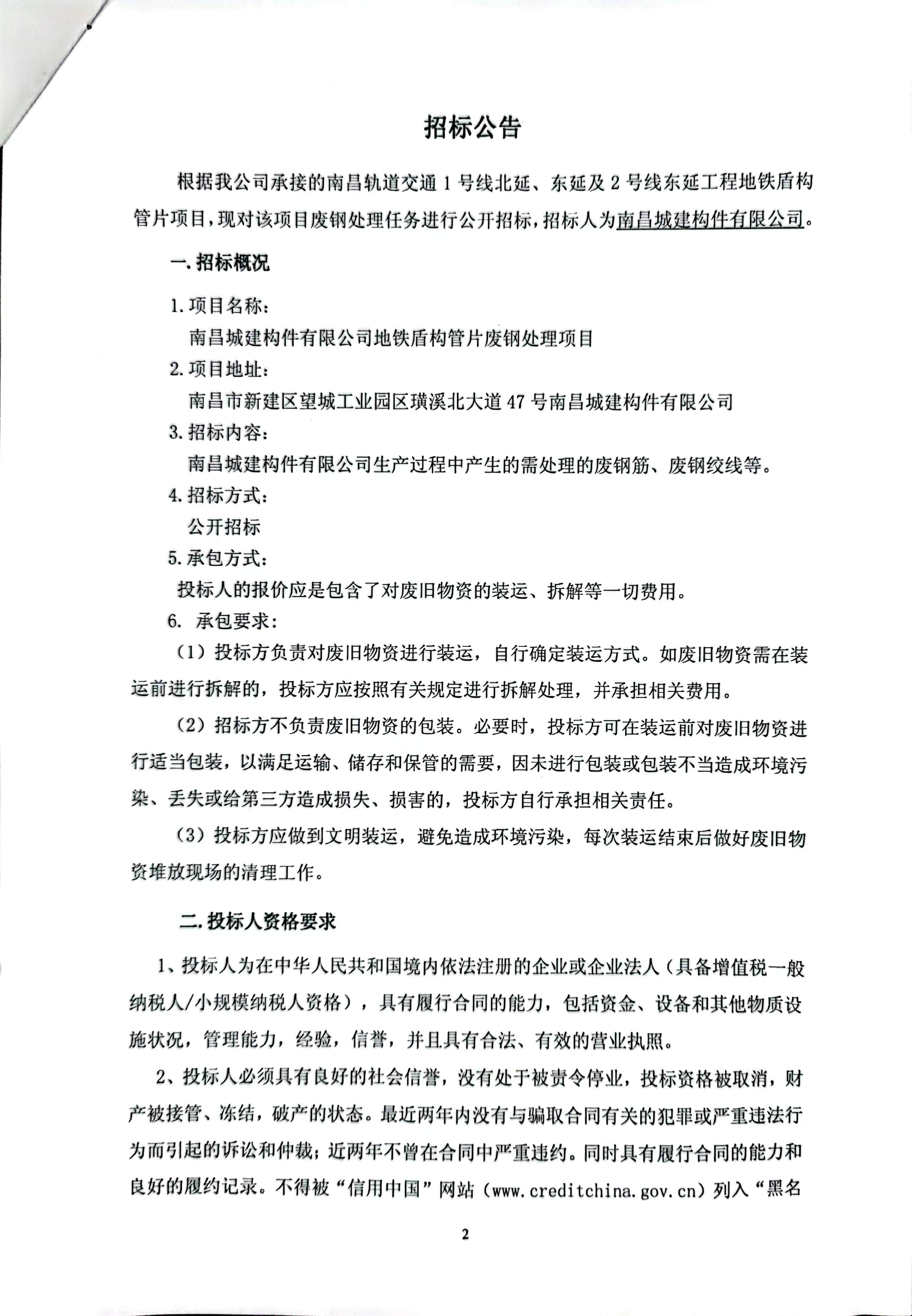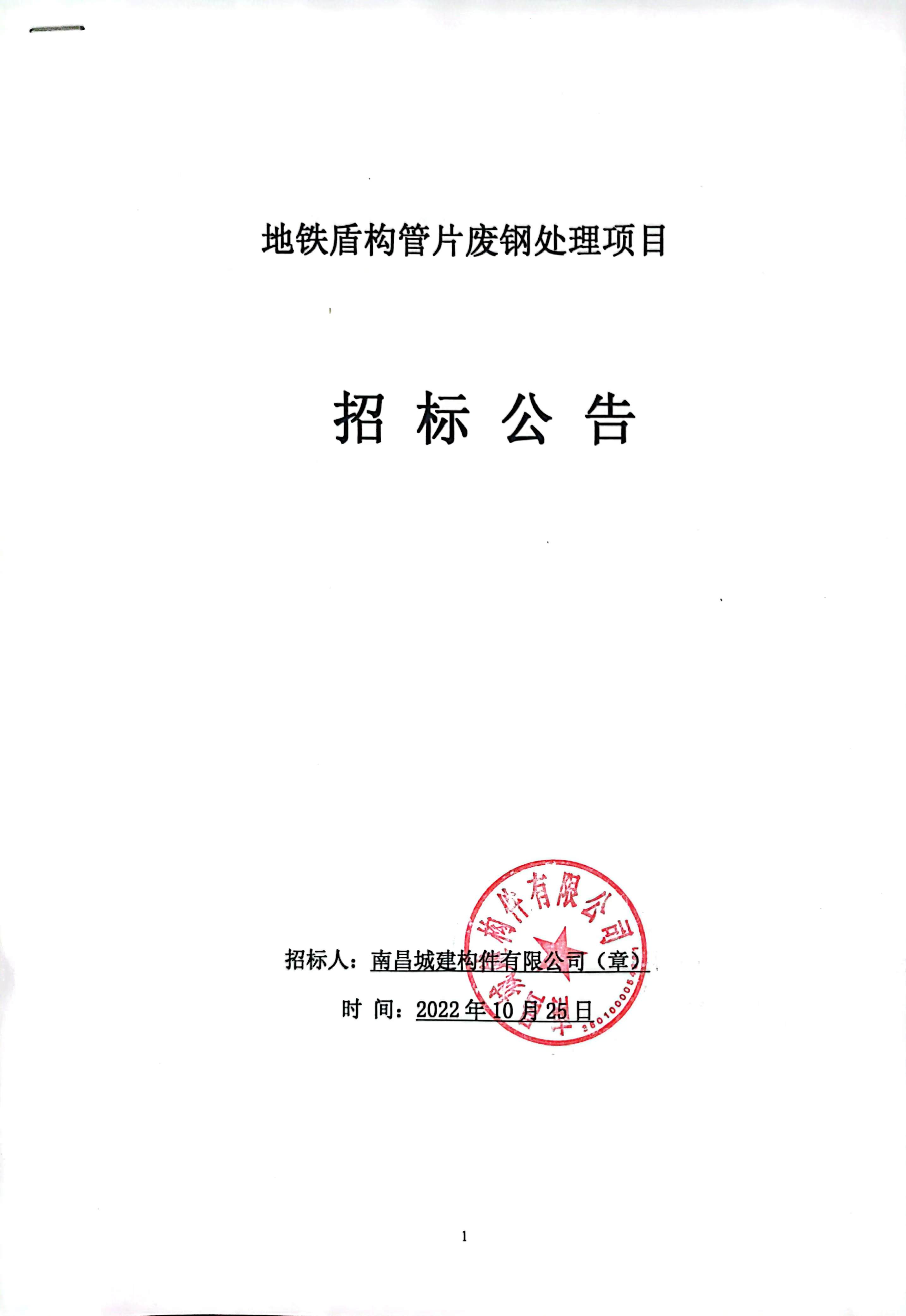根据我公司承接的南昌轨道交通1号线北延、东延及2号线东延工程地铁盾构管片项目,现对该项目废钢处理任务进行公开招标,招标人为ok138cn太阳集团构件有限公司。