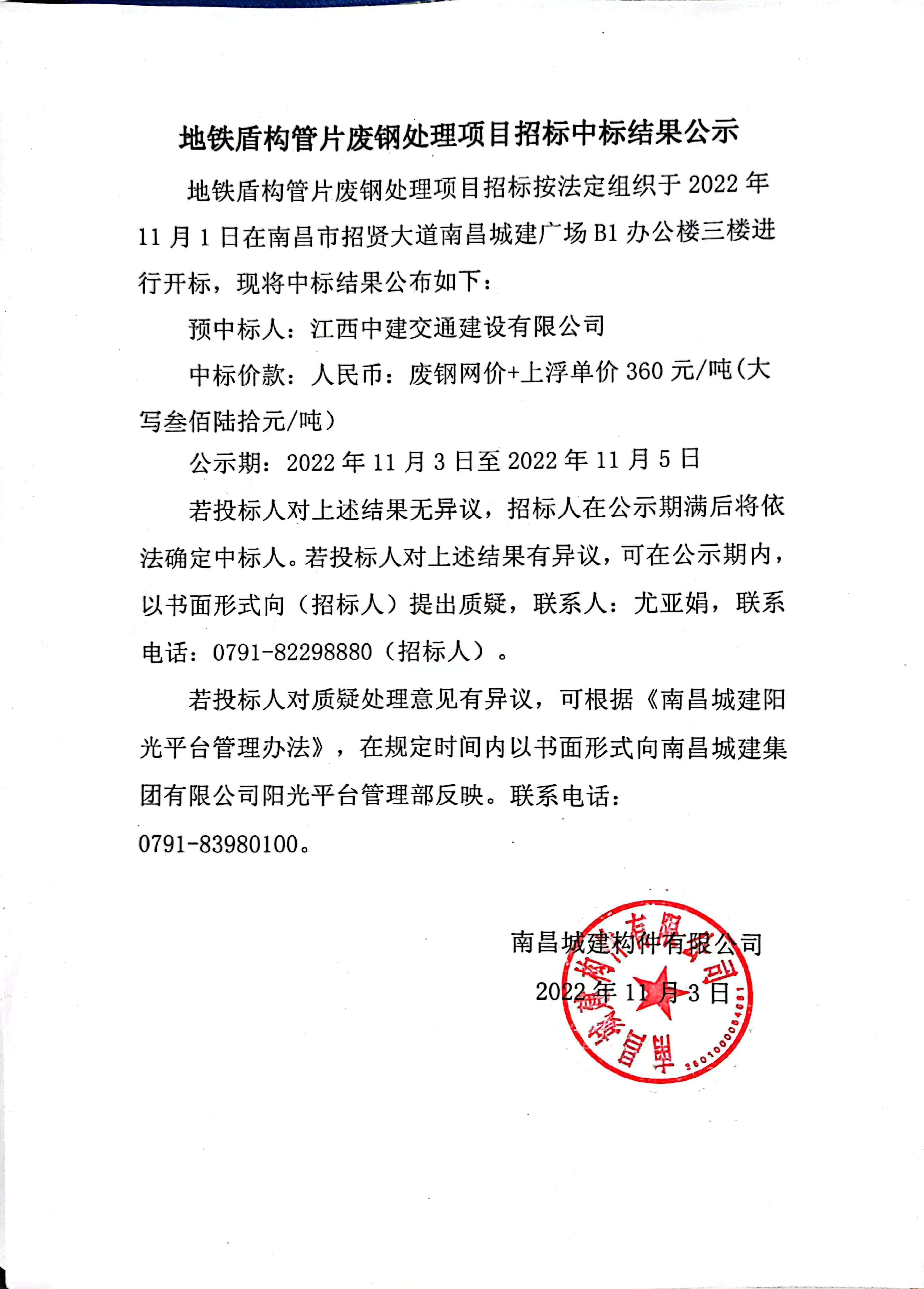 地铁盾构管片废钢处理项目招标按法定组织于2022年11月1日在南昌市招贤大道ok138cn太阳集团广场B1办公楼三楼进行开标,现将中标结果公布如下: