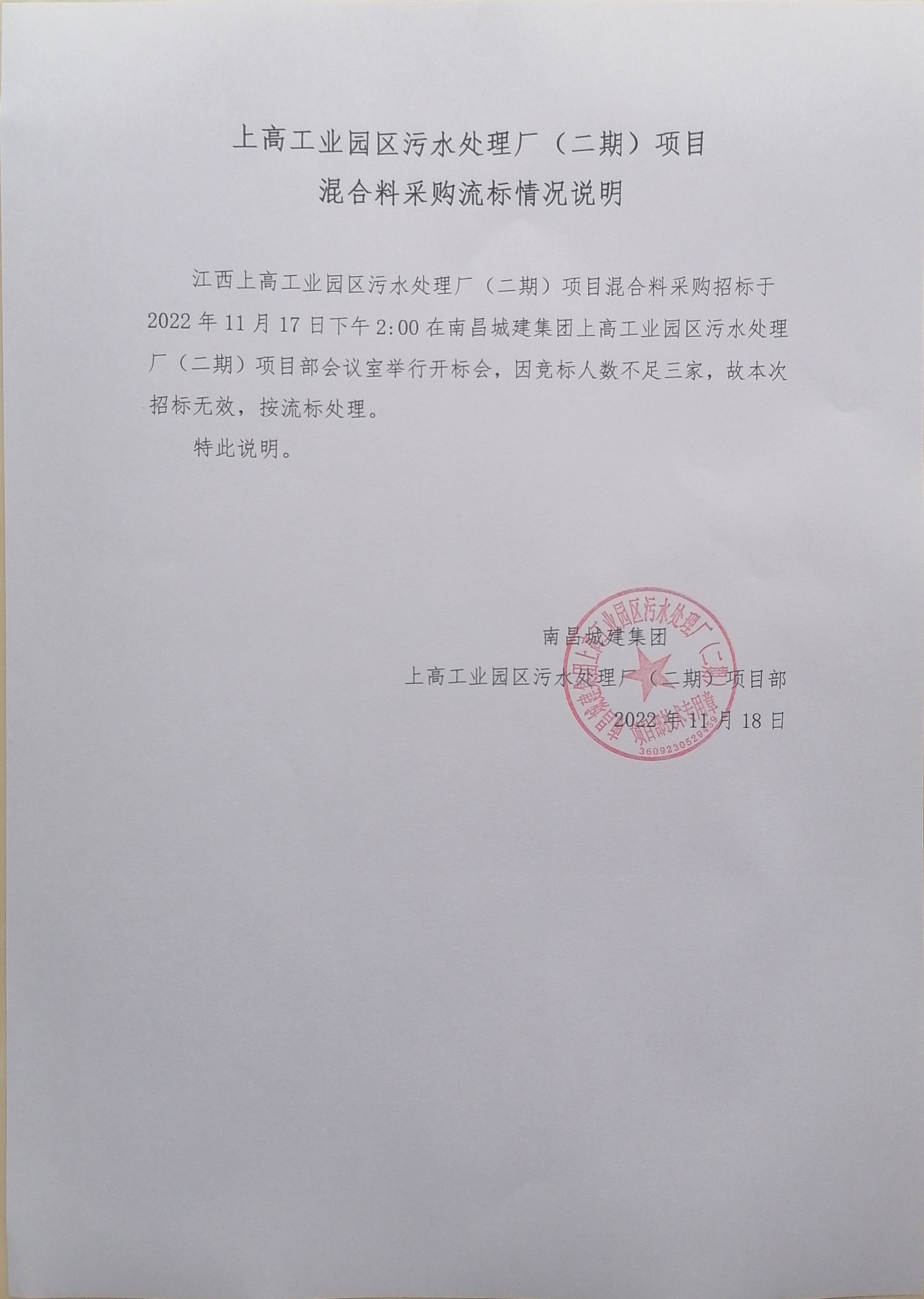 江西上高工业园区污水处理厂(二期)项目混合料采购招标于2022年11月17日下午2:00在ok138cn太阳集团集团上高工业园区污水处理厂(二期)项目部会议室举行开标会,因竞标人数不足三家,故本次招标无效,按流标处理。
