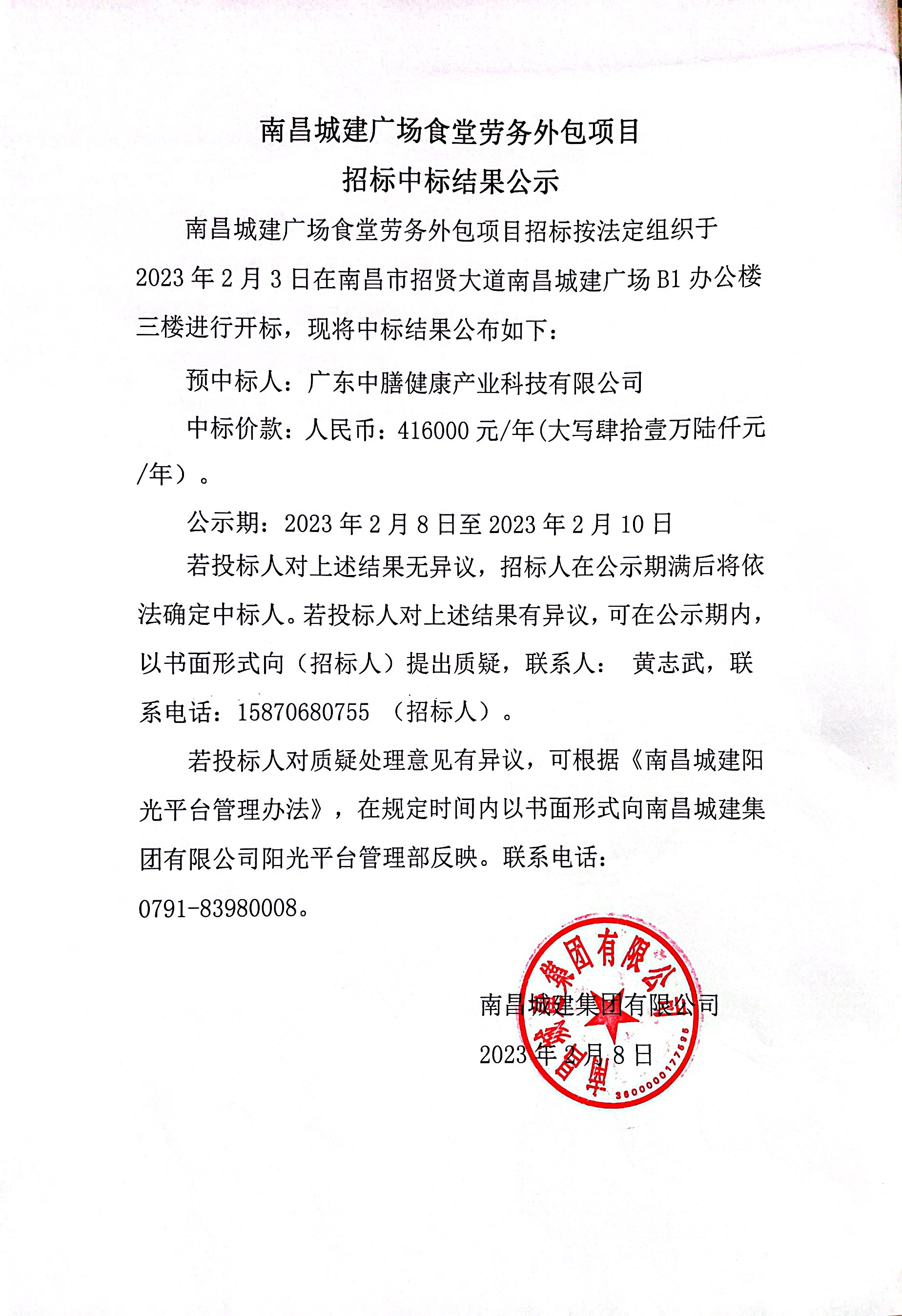 ok138cn太阳集团广场食堂劳务外包项目招标按法定组织于2023年2月3日在南昌市招贤大道ok138cn太阳集团广场B1办公楼三楼进行开标,现将中标结果公布如下: