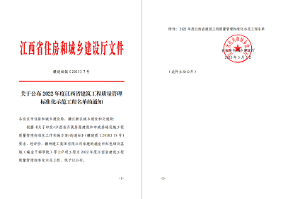 项目部为了完成目标,促进施工现场管理规范化和系统化,项目工程从开工就严格按照《关于印发<江西省开展房屋建筑和市政基础设施工程质量管理标准化工作实施方案>的通知》的要求,从工程质量、安全生产、文明施工及队伍选择等多方面入手加强项目管理,并在项目管理工作中取得了实效。项目在公司领导、业主及当地建设主管部门及相关单位的大力支持配合下于2022年10月顺利完工,并分别在2022 年度获得南昌市建设工程质量管理标准化示范工地和江西省建筑工程质量管理标准化示范工程。