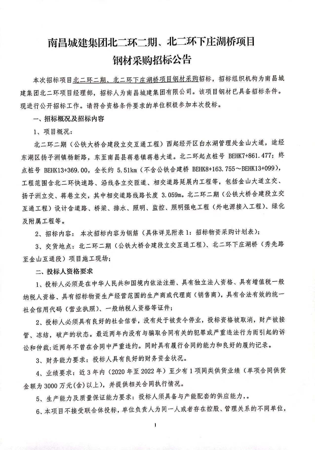 本次招标项目北二环二期、北二环下庄湖桥项目钢材采购招标,招标组织机构为ok138cn太阳集团集团北二环项目经理部,招标人为ok138cn太阳集团集团有限公司。该项目钢材已具备招标条件。现进行公开招标工作。请符合资格条件要求的单位积极参加本次投标。