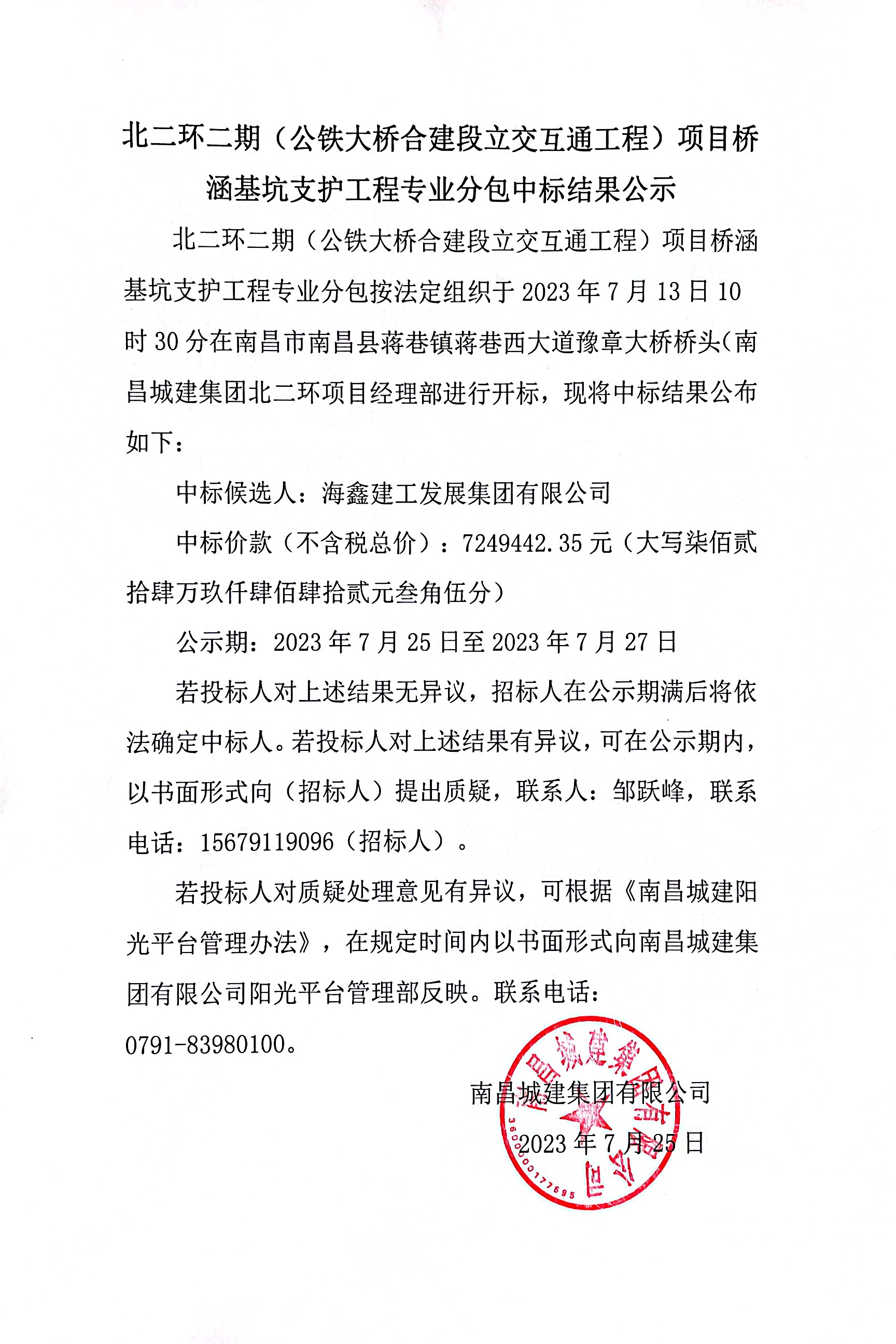 北二环二期(公铁大桥合建段立交互通工程)项目桥涵基坑支护工程专业分包按法定组织于2023年7月13日10时30分在南昌市南昌县蒋巷镇蒋巷西大道豫章大桥桥头(ok138cn太阳集团集团北二环项目经理部进行开标,现将中标结果公布如下: