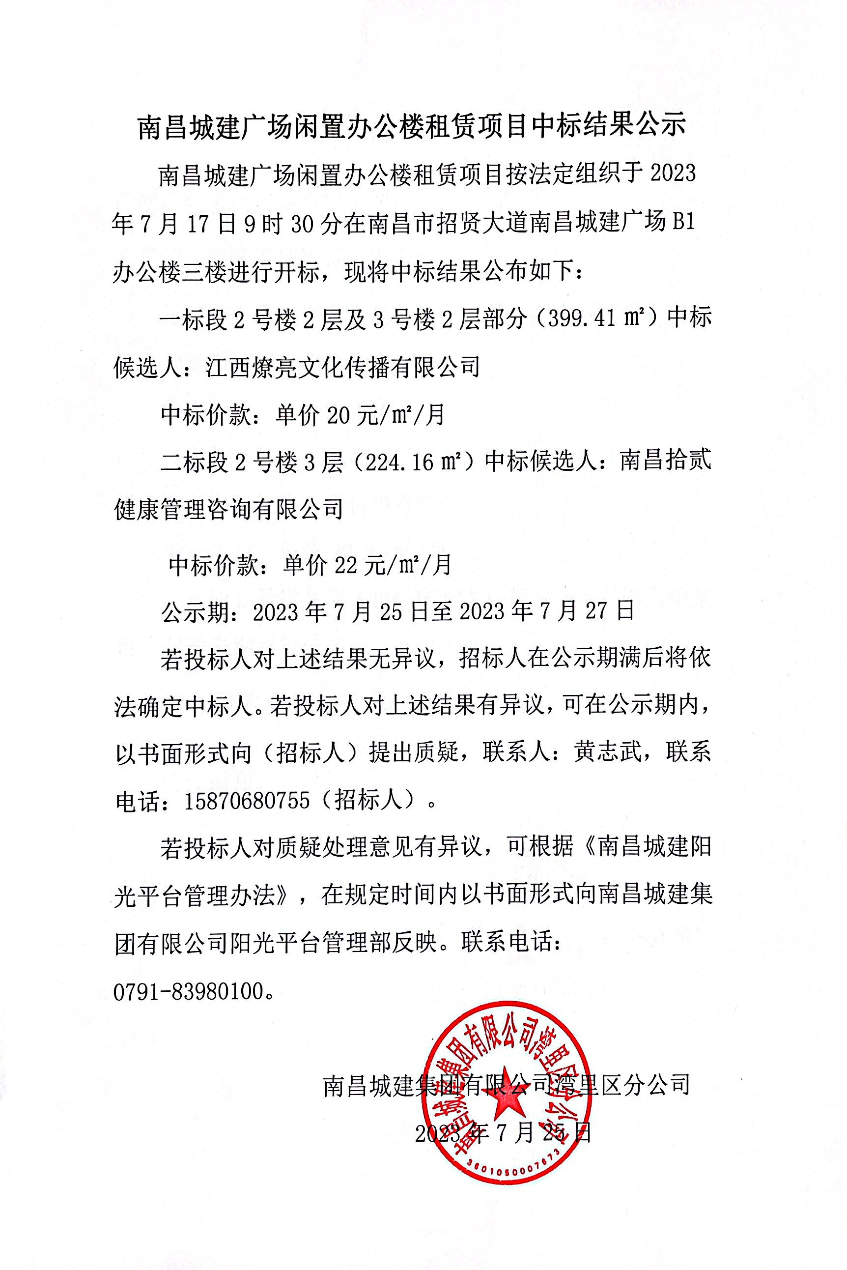 ok138cn太阳集团广场闲置办公楼租赁项目按法定组织于2023年7月17日9时30分在南昌市招贤大道ok138cn太阳集团广场B1办公楼三楼进行开标,现将中标结果公布如下:
