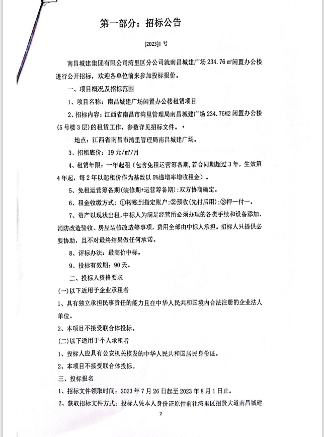 2、招标内容:江西省南昌市湾里管理局ok138cn太阳集团广场234.76M2闲置办公楼(5号楼3层)的租赁工作,参数详见招标文件。·