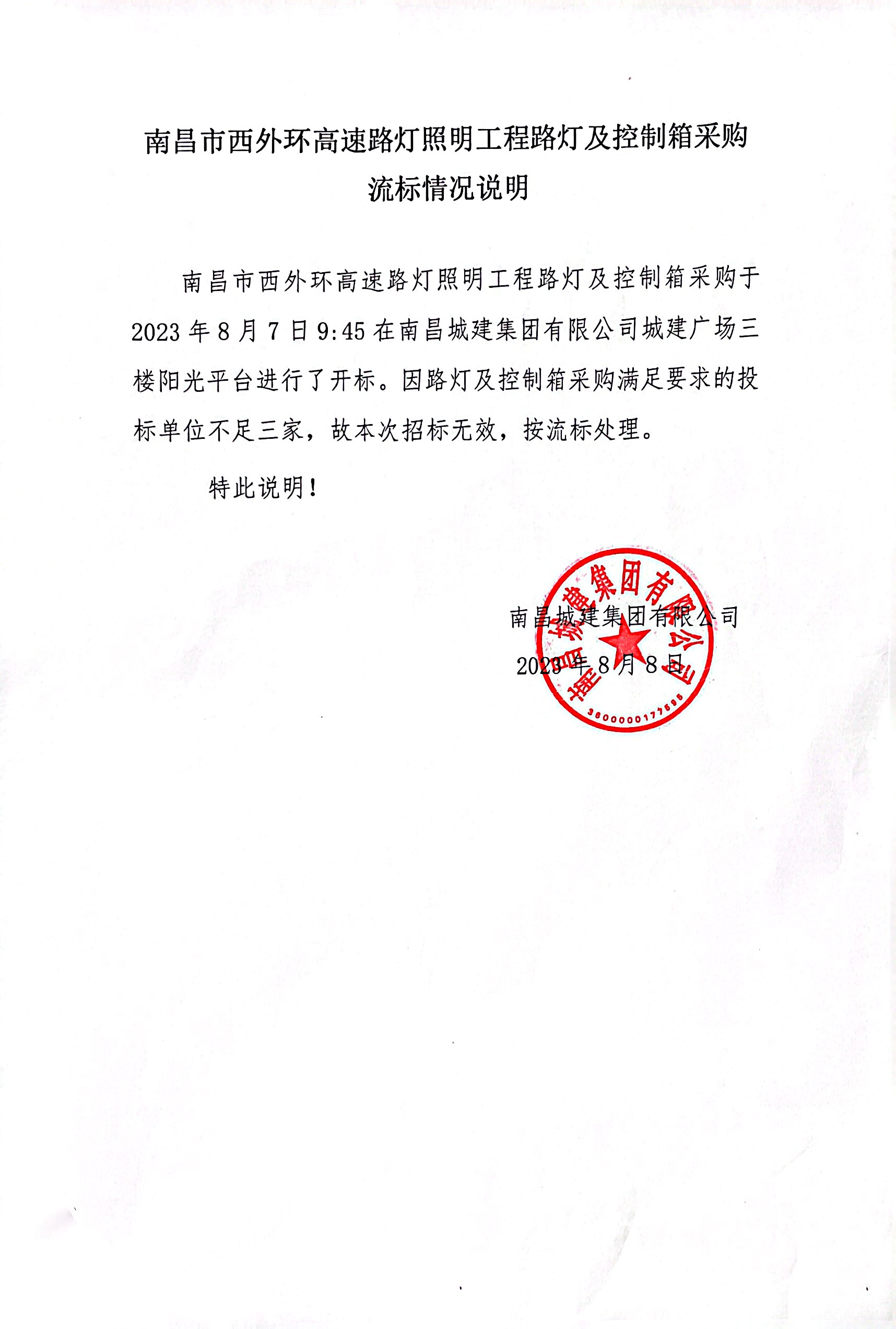 南昌市西外环高速路灯照明工程路灯及控制箱采购于2023年8月7日9:45在ok138cn太阳集团集团有限公司城建广场三楼阳光平台进行了开标。因路灯及控制箱采购满足要求的投标单位不足三家,故本次招标无效,按流标处理。