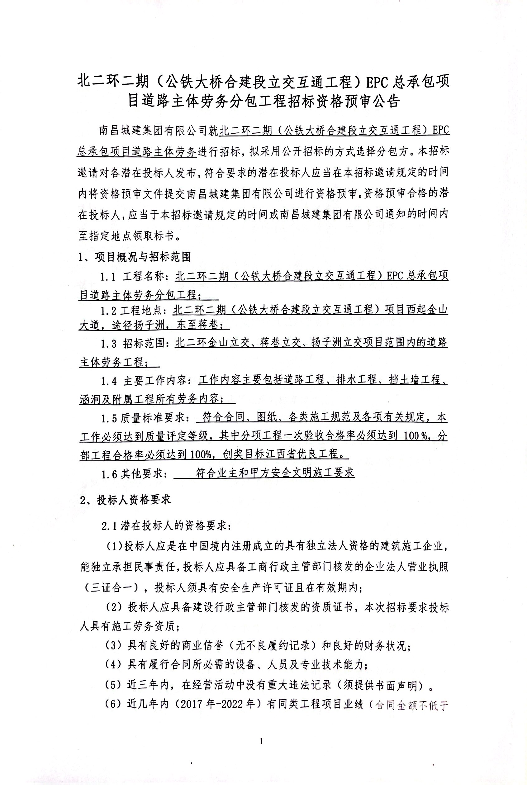 ok138cn太阳集团集团有限公司就北二环二期(公铁大桥合建段立交互通工程)EPC总承包项目道路主体劳务进行招标,拟采用公开招标的方式选择分包方。本招标邀请对各潜在投标人发布,符合要求的潜在投标人应当在本招标邀请规定的时间内将资格预审文件提交ok138cn太阳集团集团有限公司进行资格预审。资格预审合格的潜在投标人,应当于本招标邀请规定的时间或ok138cn太阳集团集团有限公司通知的时间内至指定地点领取标书。