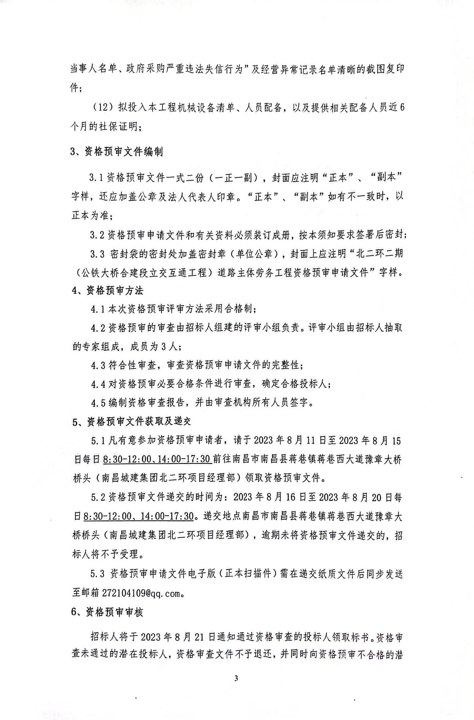 5.3 资格预审申请文件电子版(正本扫描件)需在递交纸质文件后同步发送至邮箱272104109@qq.com。