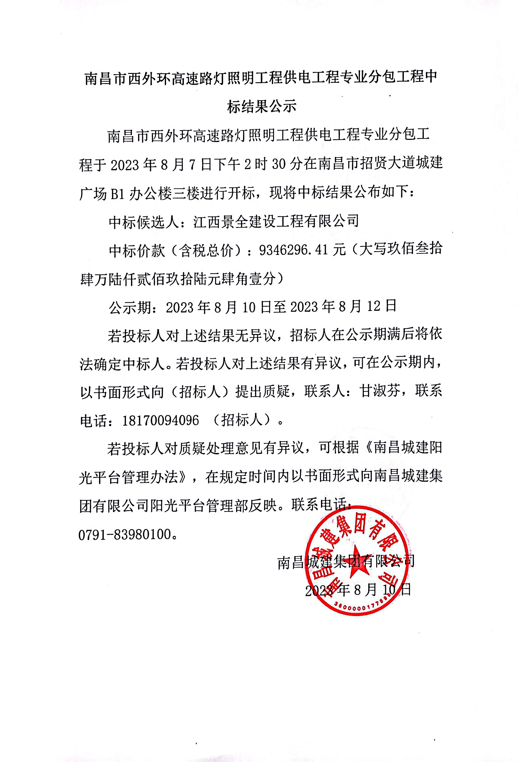 南昌市西外环高速路灯照明工程供电工程专业分包工程于2023年8月7日下午2时30分在南昌市招贤大道城建广场B1办公楼三楼进行开标,现将中标结果公布如下: