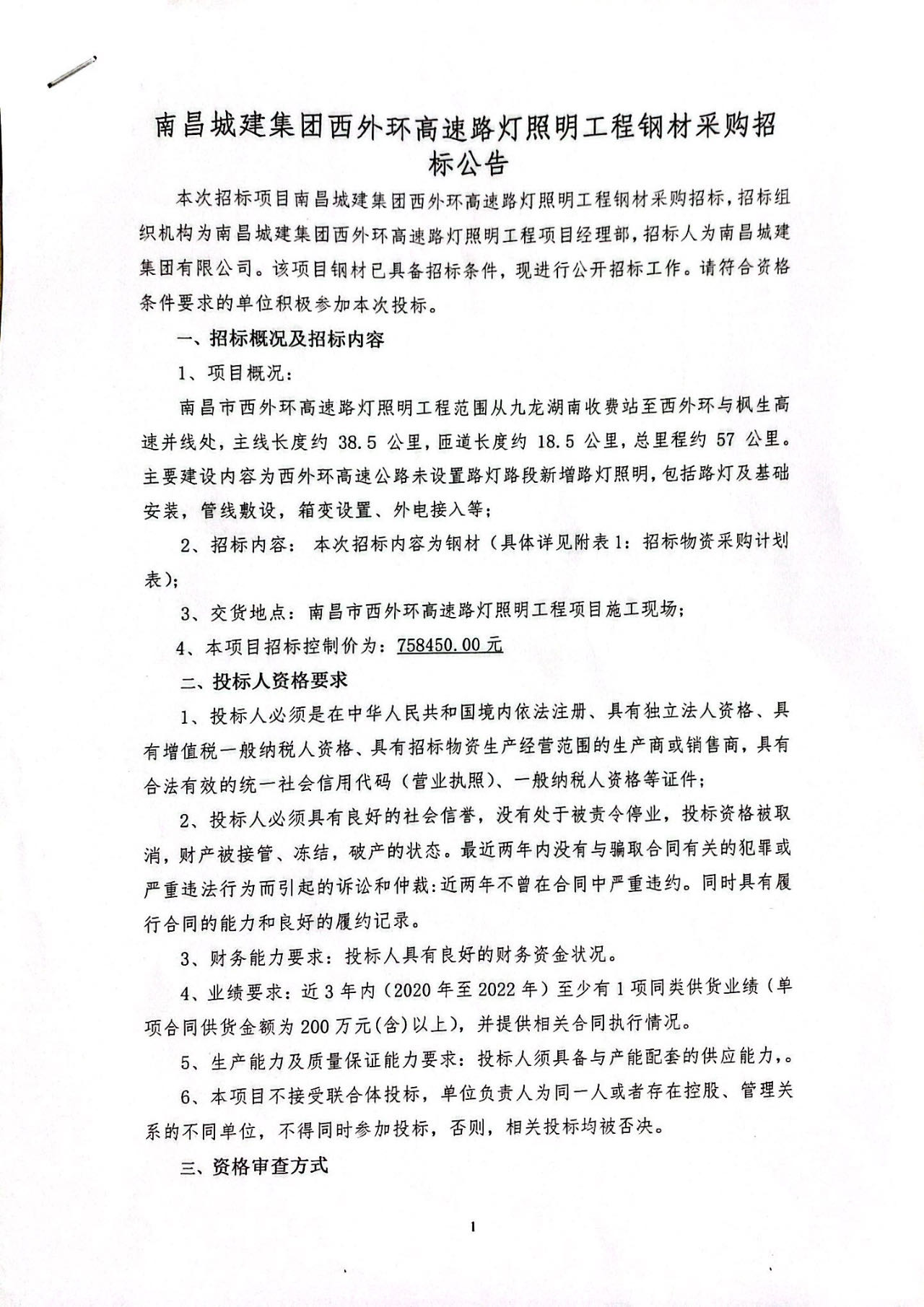 本次招标项目ok138cn太阳集团集团西外环高速路灯照明工程钢材采购招标,招标组织机构为ok138cn太阳集团集团西外环高速路灯照明工程项目经理部,招标人为ok138cn太阳集团集团有限公司。该项目钢材已具备招标条件,现进行公开招标工作。请符合资格条件要求的单位积极参加本次投标。