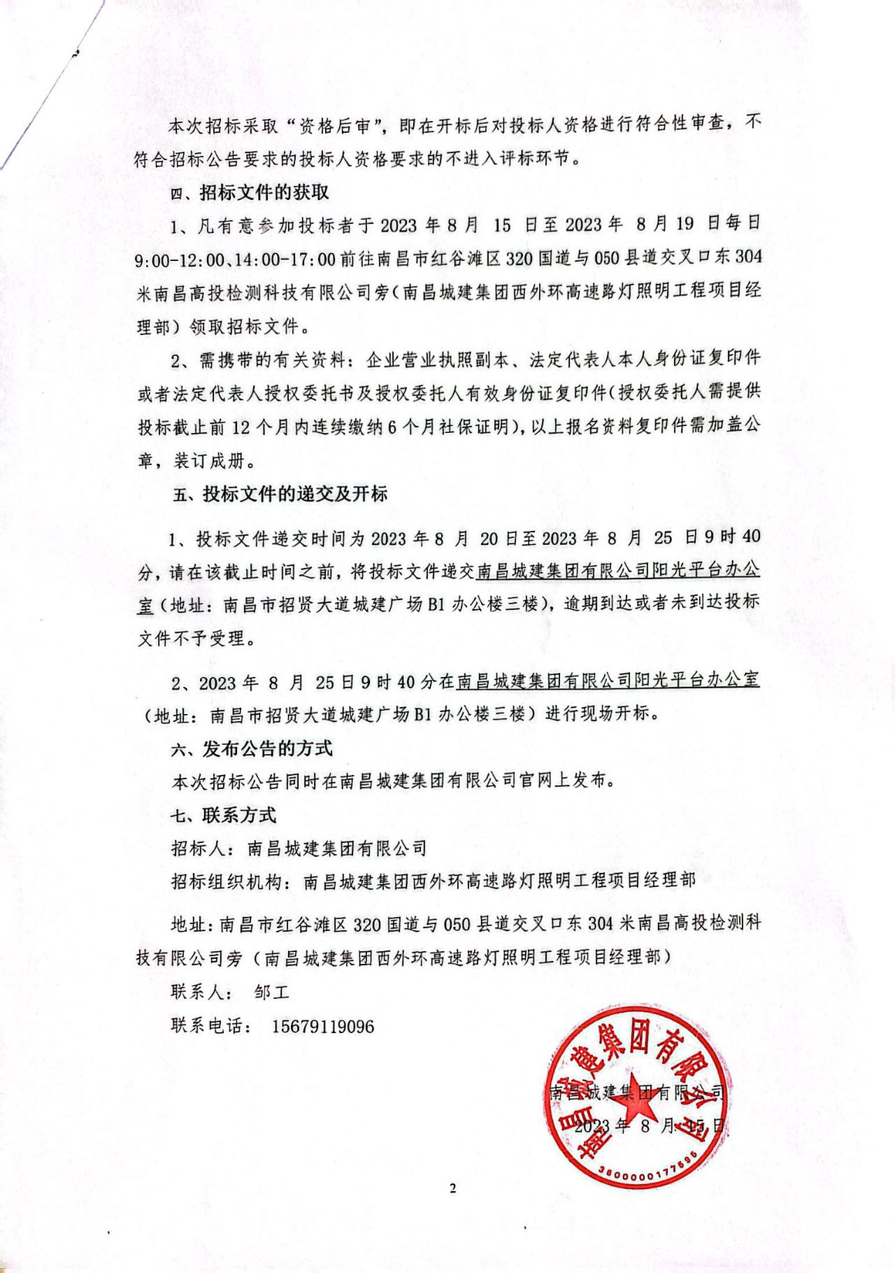 1、凡有意参加投标者于2023年8月 15 日至2023年 8月19 日每日9:00-12:00、14:00-17:00前往南昌市红谷滩区320国道与050县道交叉口东304米南昌高投检测科技有限公司旁(ok138cn太阳集团集团西外环高速路灯照明工程项目经理部)领取招标文件。