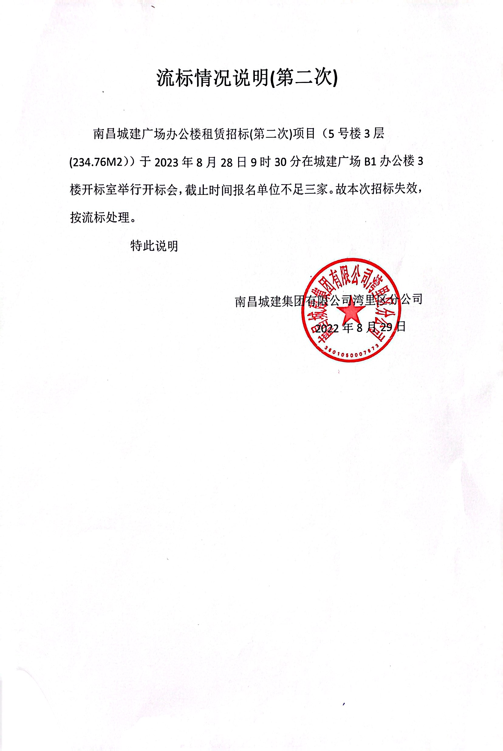 ok138cn太阳集团广场办公楼租赁招标(第二次)项目(5号楼3层(234.76M2))于2023年8月28日9时30分在城建广场B1办公楼3楼开标室举行开标会,截止时间报名单位不足三家。故本次招标失效,按流标处理。