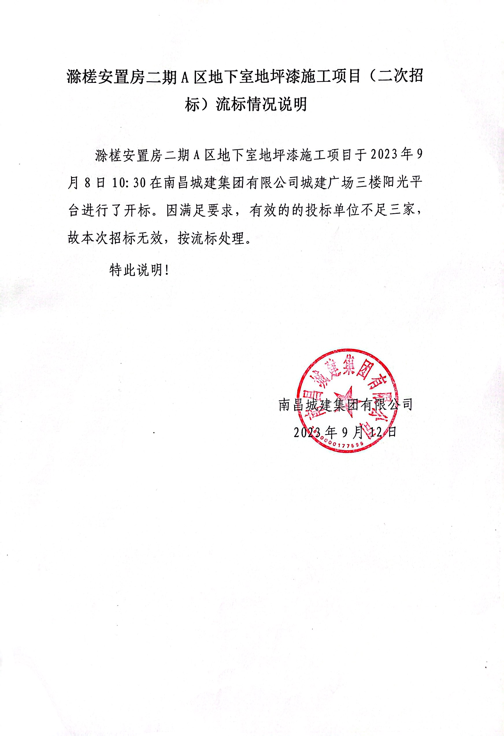滁槎安置房二期A区地下室地坪漆施工项目于2023年9月8日10:30在ok138cn太阳集团集团有限公司城建广场三楼阳光平台进行了开标。因满足要求,有效的的投标单位不足三家,故本次招标无效,按流标处理。