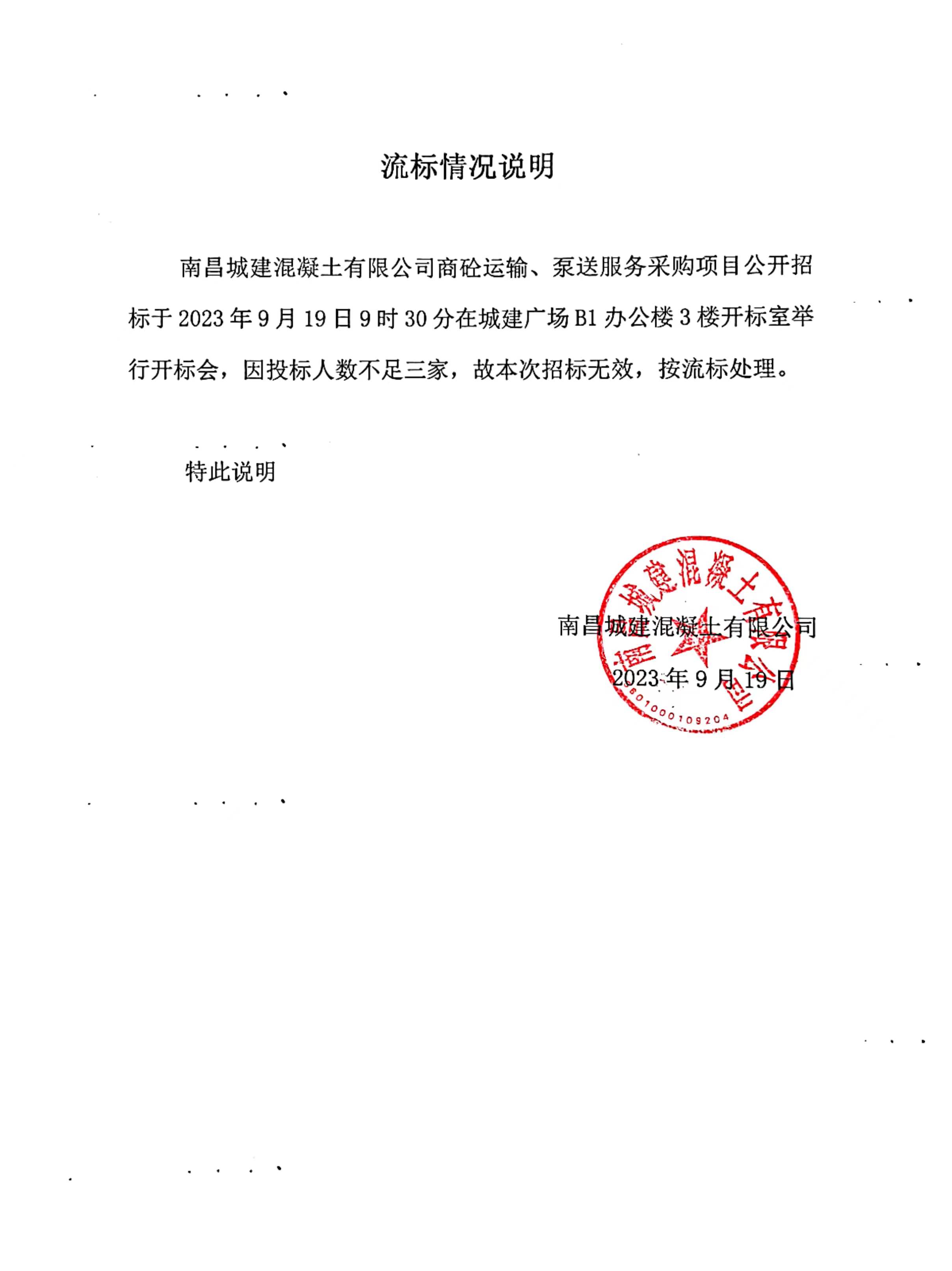 ok138cn太阳集团混凝土有限公司商砼运输、泵送服务采购项目公开招标于2023年9月19日9时30分在城建广场B1办公楼3楼开标室举行开标会,因投标人数不足三家,故本次招标无效,按流标处理。
