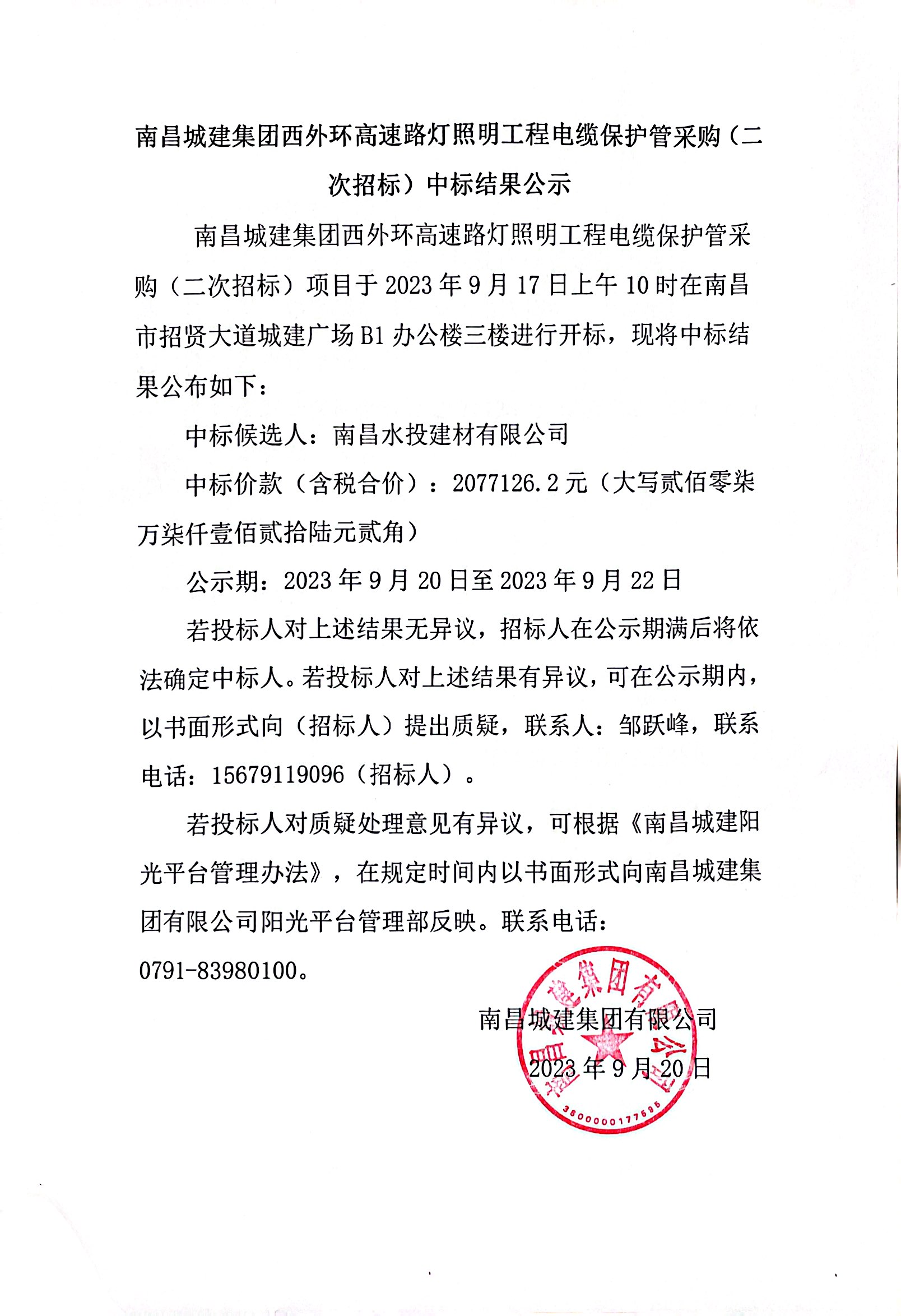 ok138cn太阳集团集团西外环高速路灯照明工程电缆保护管采购(二次招标)项目于2023年9月17日上午10时在南昌市招贤大道城建广场B1办公楼三楼进行开标,现将中标结果公布如下: