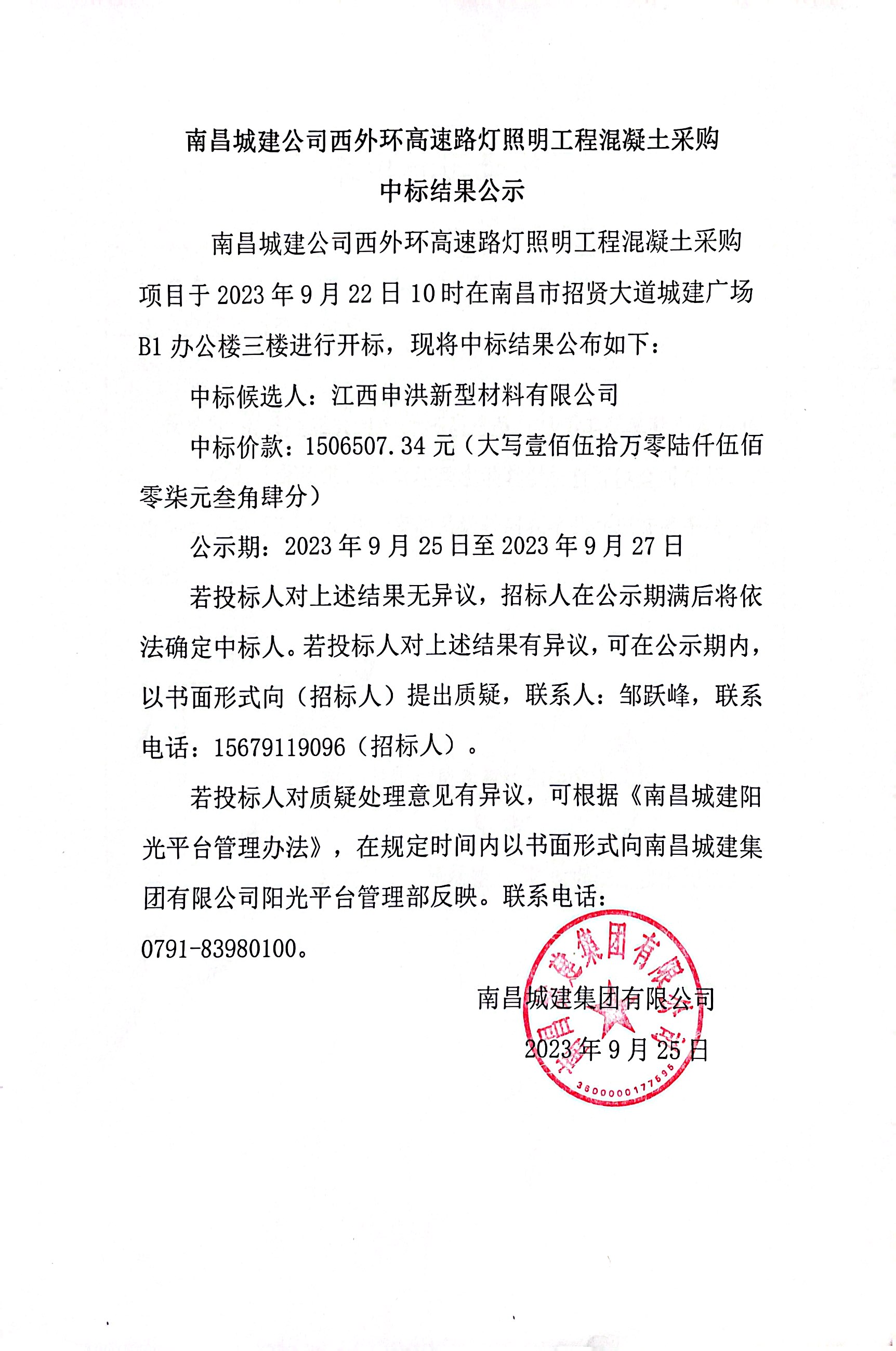 ok138cn太阳集团公司西外环高速路灯照明工程混凝土采购项目于2023年9月22日10时在南昌市招贤大道城建广场B1办公楼三楼进行开标,现将中标结果公布如下: