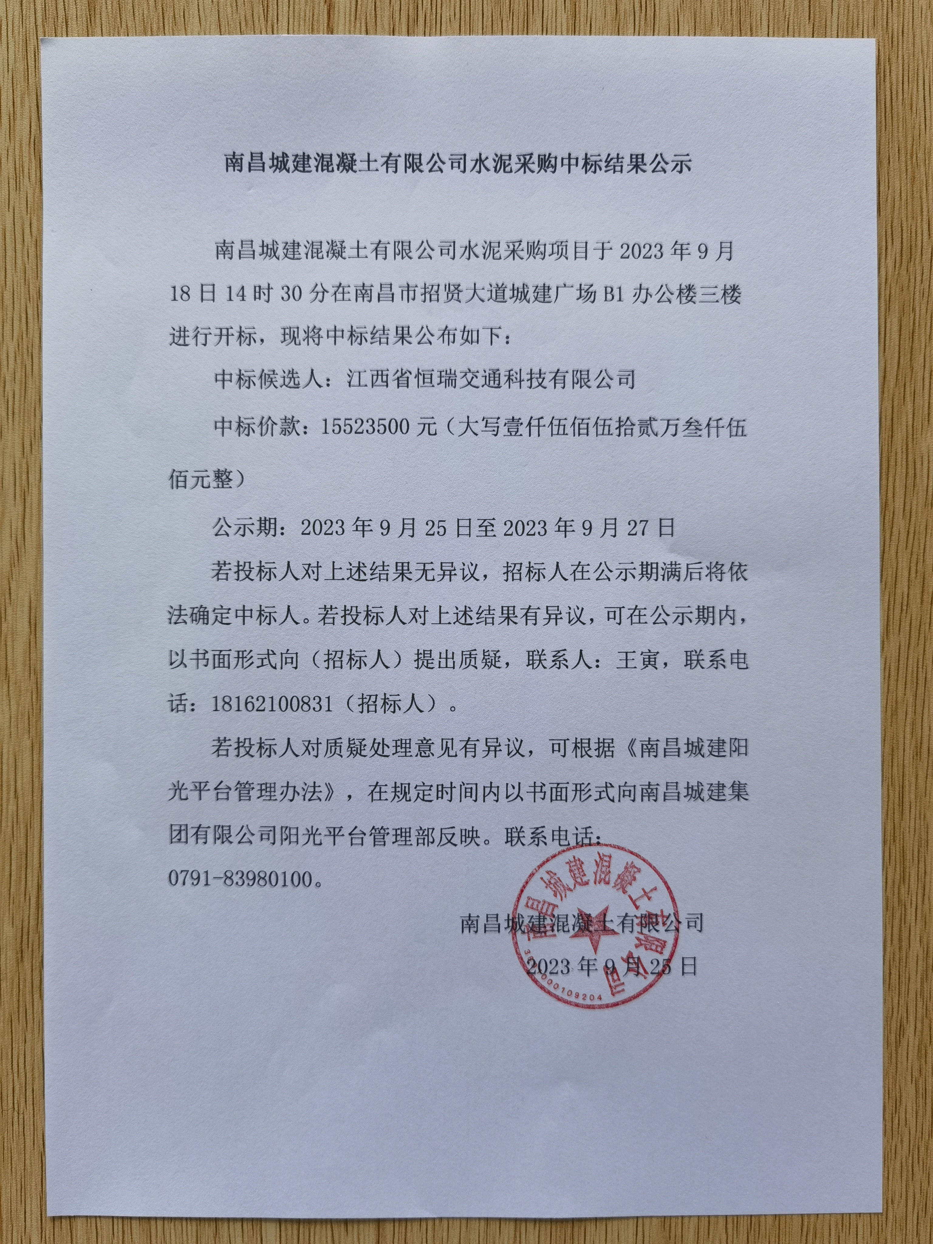 ok138cn太阳集团混凝土有限公司水泥采购项目于2023年9月18日14时30分在南昌市招贤大道城建广场B1办公楼三楼进行开标,现将中标结果公布如下: