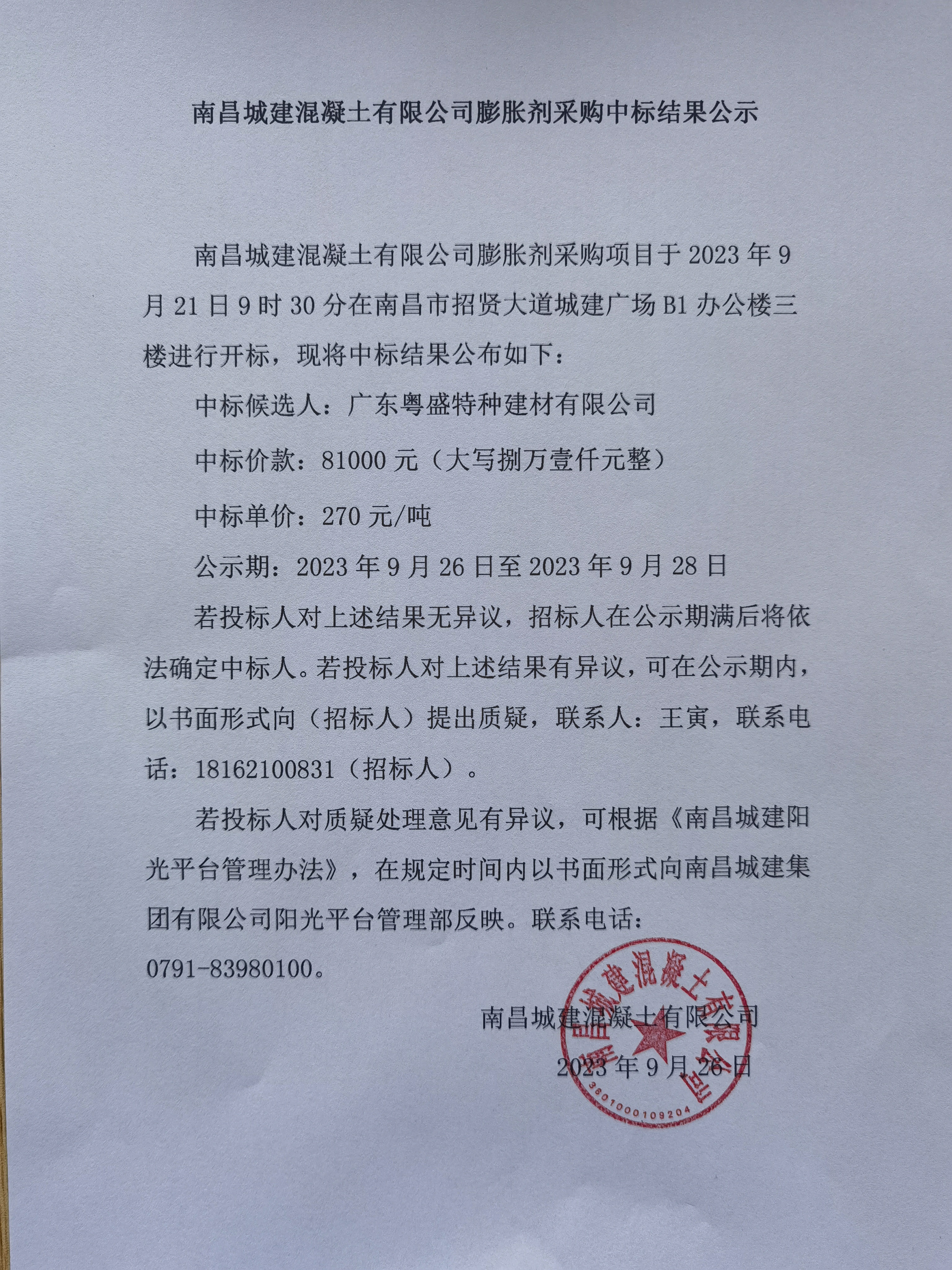ok138cn太阳集团混凝土有限公司膨胀剂采购项目于2023年9月21日9时30分在南昌市招贤大道城建广场B1办公楼三楼进行开标,现将中标结果公布如下: