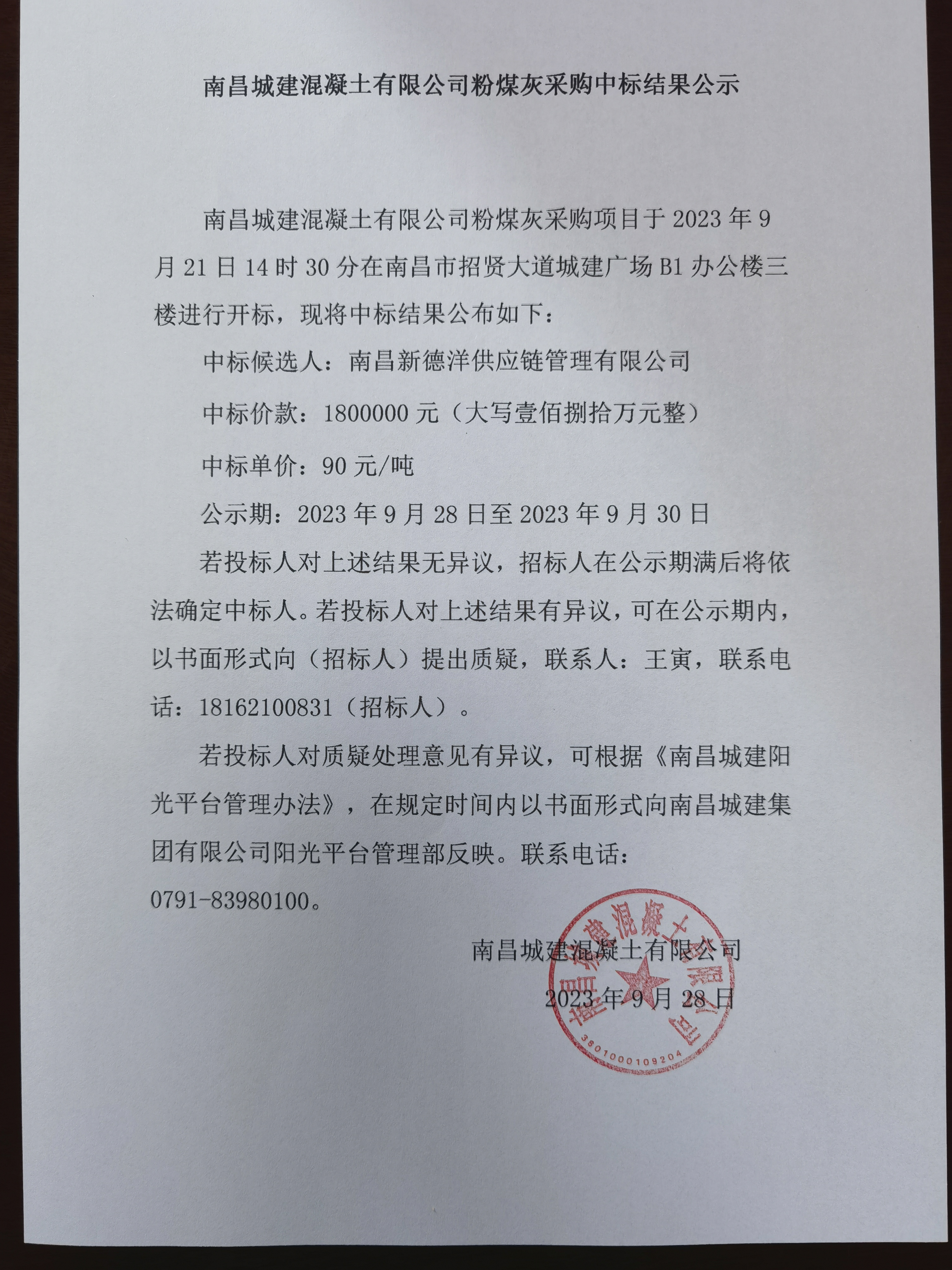 ok138cn太阳集团混凝土有限公司粉煤灰采购项目于2023年9月21日14时30分在南昌市招贤大道城建广场B1办公楼三楼进行开标,现将中标结果公布如下: