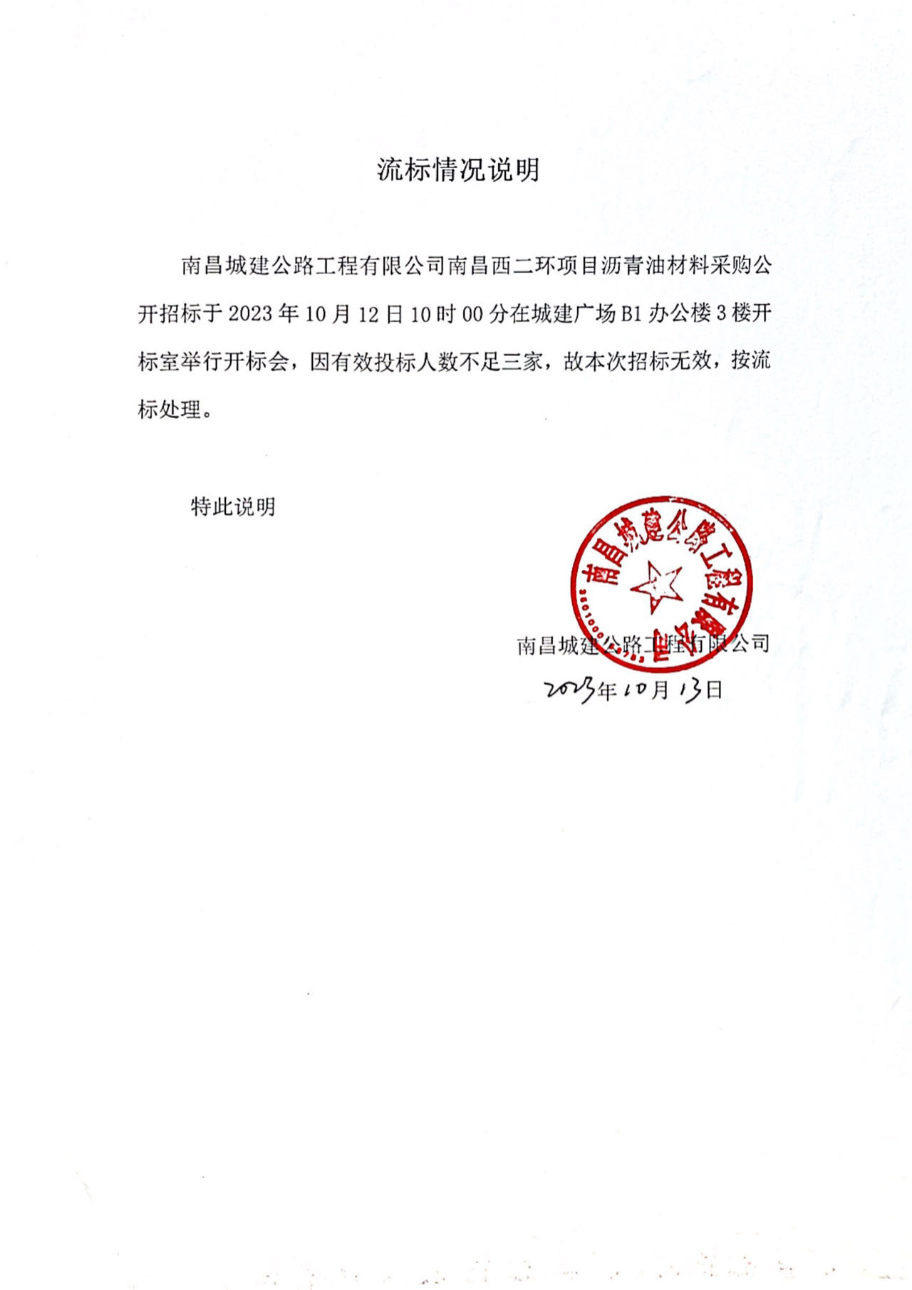 ok138cn太阳集团公路工程有限公司南昌西二环项目沥青油材料采购公开招标于2023年10月12日10时00分在城建广场B1办公楼3楼开标室举行开标会,因有效投标人数不足三家,故本次招标无效,按流标处理。