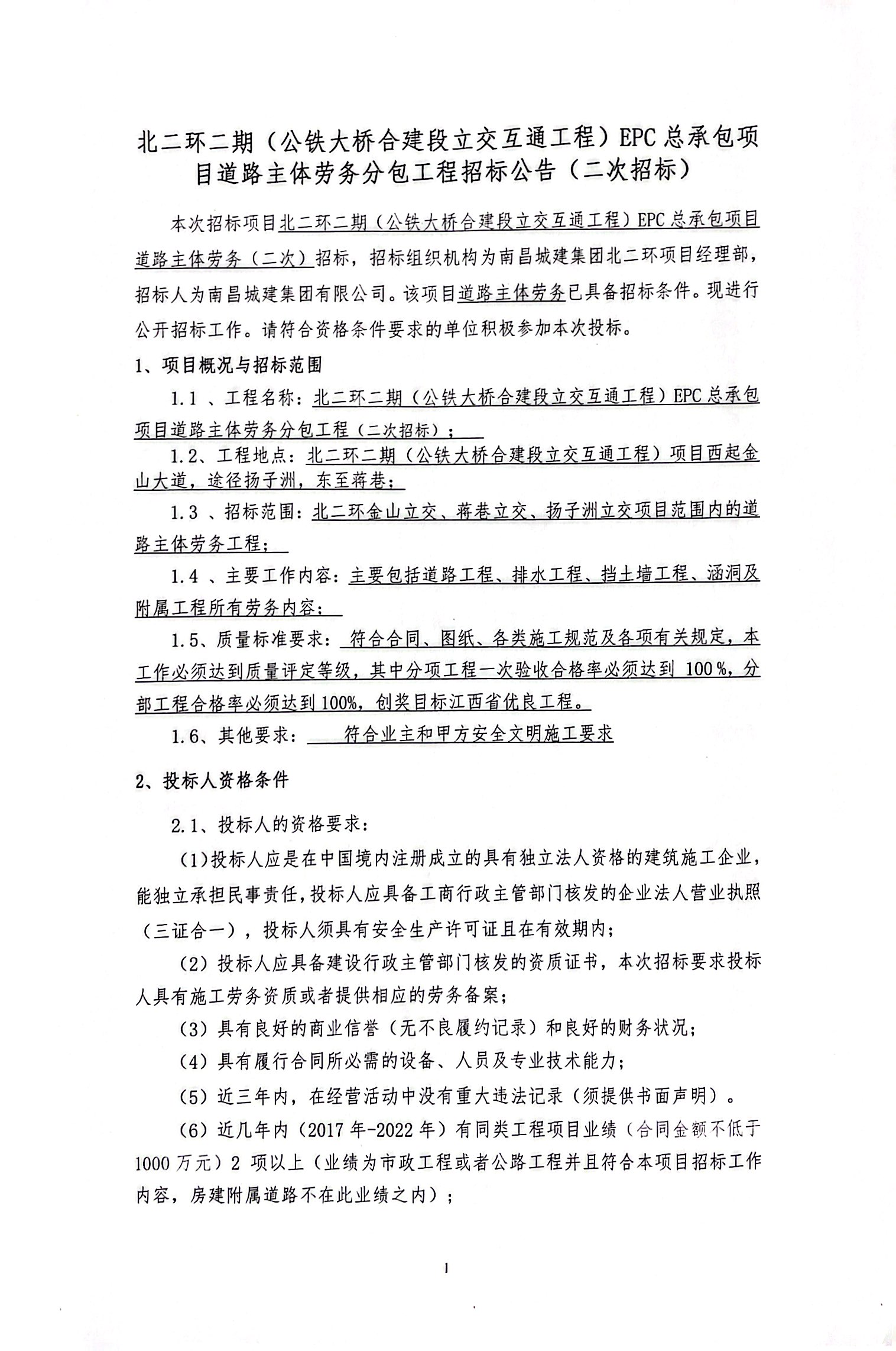 1.1 、工程名称:北二环二期(公铁大桥合建段立交互通工程)EPC总承包项目道路主体劳务分包工程(二次招标);