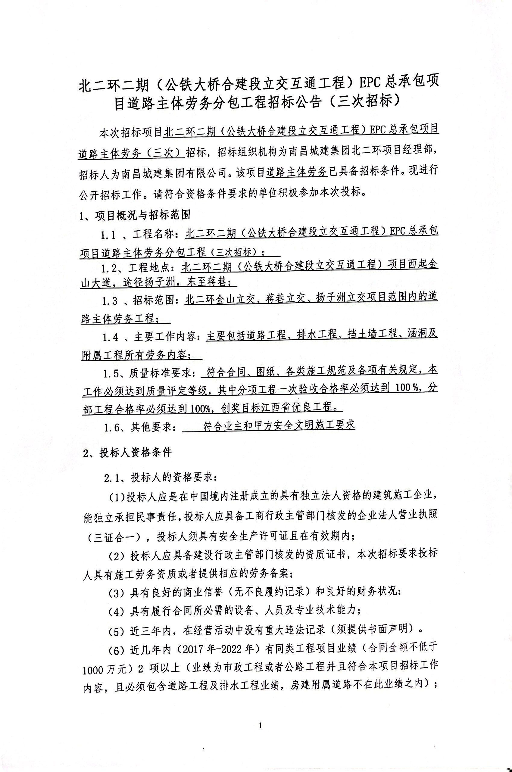 1.1 、工程名称:北二环二期(公铁大桥合建段立交互通工程)EPC总承包项目道路主体劳务分包工程(三次招标);